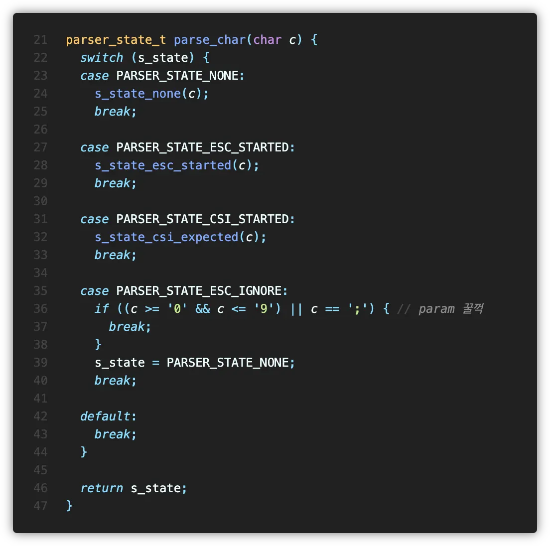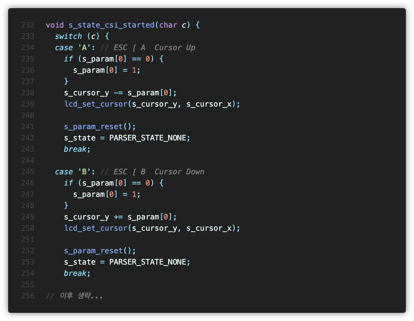 ESC 문자의 여부, CSI(ESC + [)의 시작 여부 등에 따라 이후의 내용을 처리하도록 했습니다.