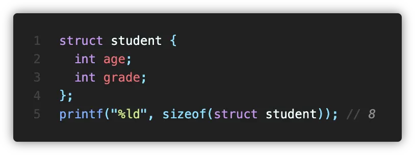 실제로, 구조체를 생성한 후 siezof() 연산자를 통해 크기를 확인하면 8 byte 공간을 차지한다는 것을 알 수 있습니다. 위의 오른쪽 사진과 동일하죠.