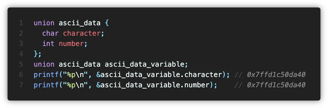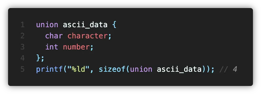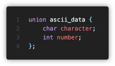 위의 왼쪽과 같은 코드로 공용체를 생성하면 메모리에는 오른쪽 사진과 같이 저장됩니다. 즉, 공용체는 멤버 변수 중 가장 큰 변수의 타입 만큼 공간을 차지합니다.