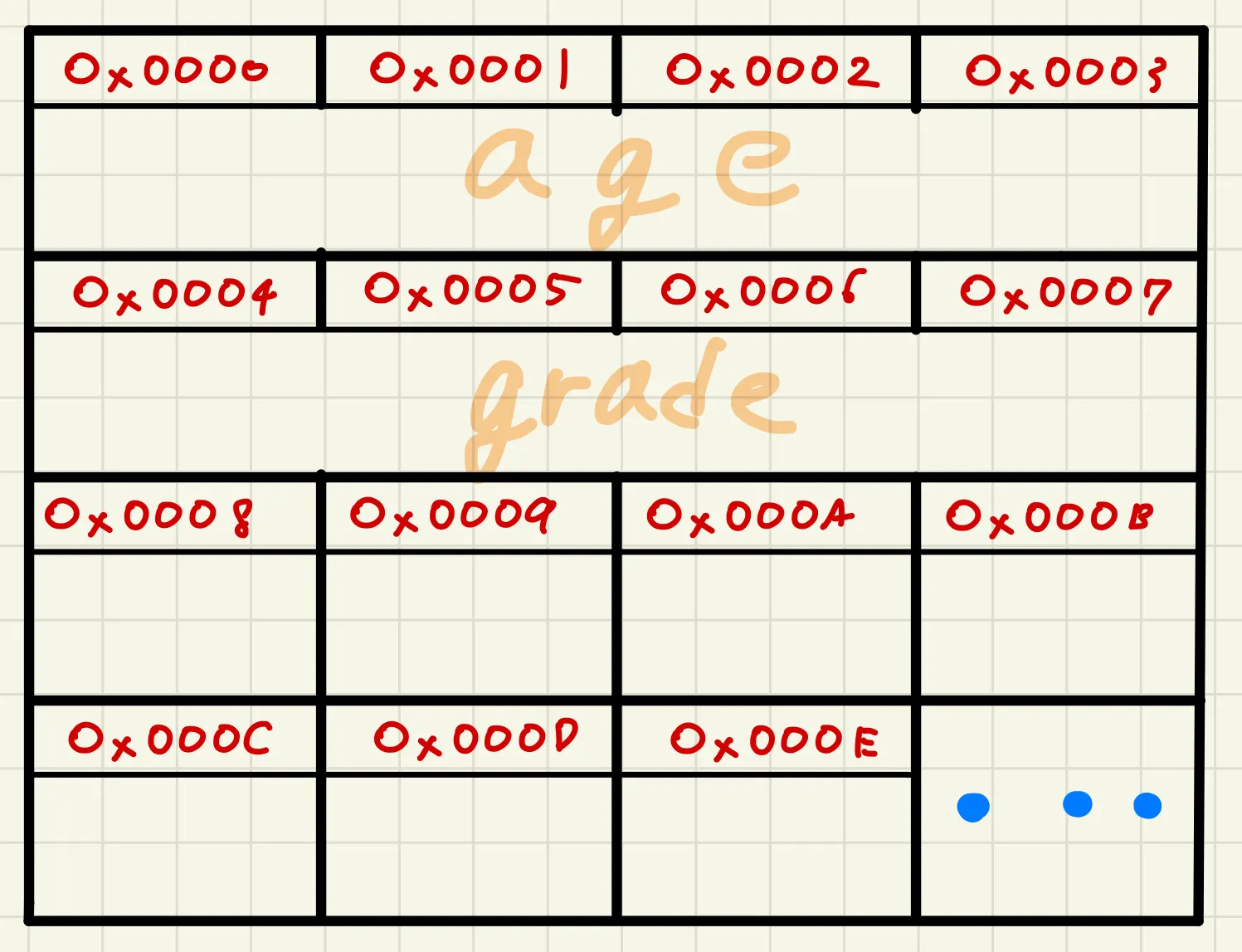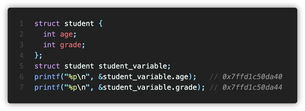 구조체 변수를 생성한 후 메모리의 주소를 확인해보면 grade의 메모리 주소가 age에 비해 int 자료형에서 차지하는 공간인 4 byte만큼 뒤에 있는 것을 알 수 있습니다.