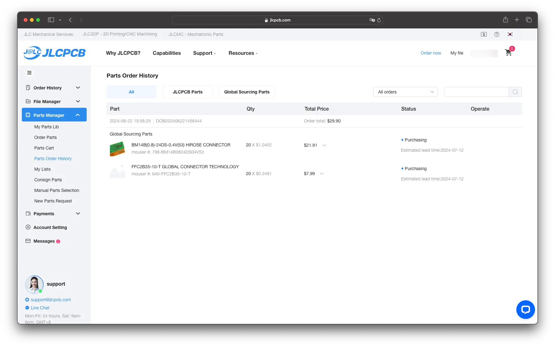 한편, JLCPCB는 모회사인 LCSC의 부품을 활용해 SMT 서비스를 제공합니다. 만약 LCSC에서 보유하지 않거나 재고가 없는 부품이라면 Global Sourcing 서비스를 통해 LCSC가 아닌 Mourser 등 다른 공급사의 부품을 사용할 수 있습니다.