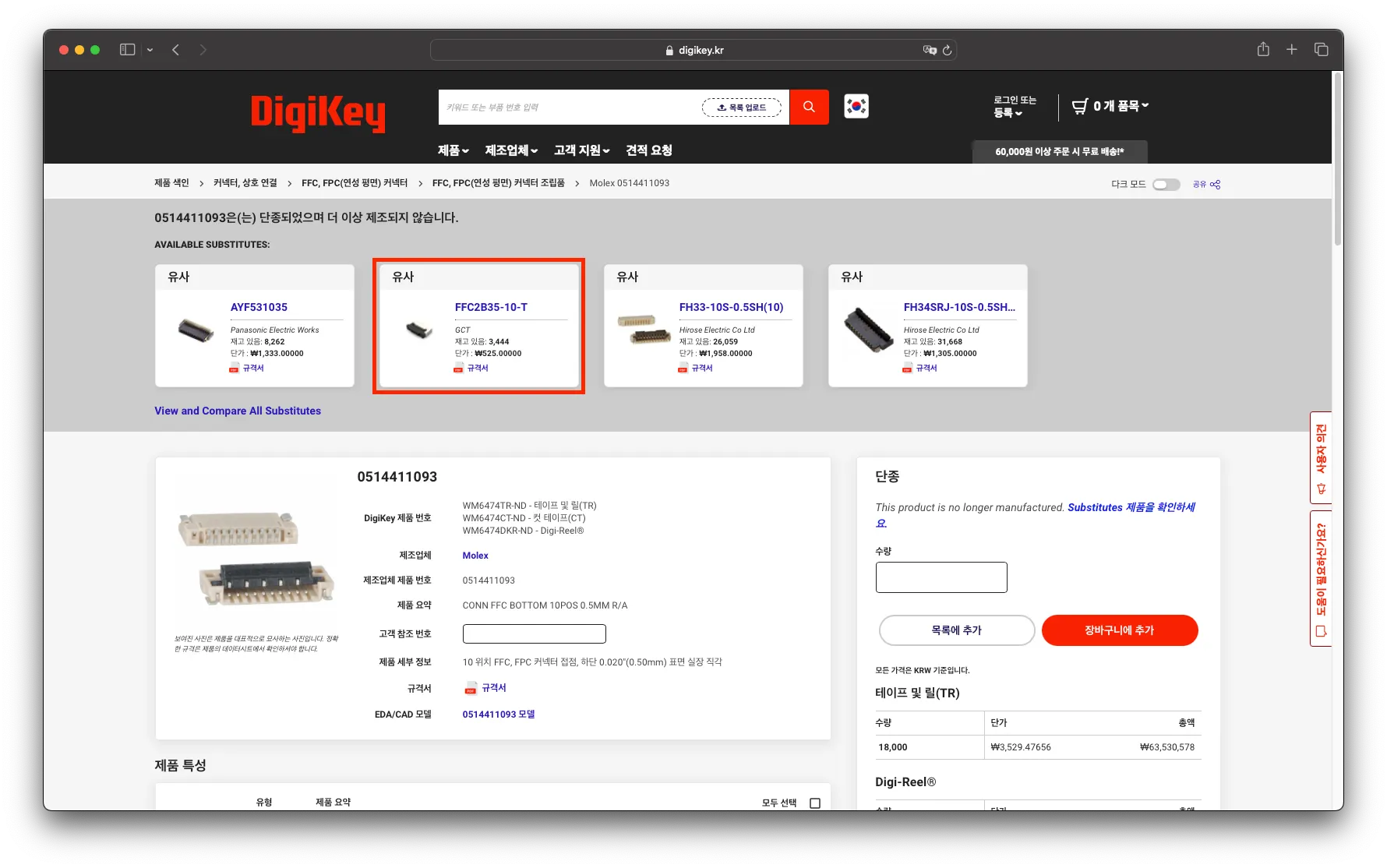 DigiKey에서 찾아보니 FFC2B35-10-T라는 대체품이 있었는데요, 데이터시트를 확인해 보니 사용할 수 있어 보여 이 커넥터를 사용하기로 했습니다.