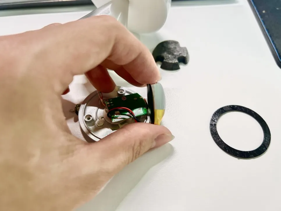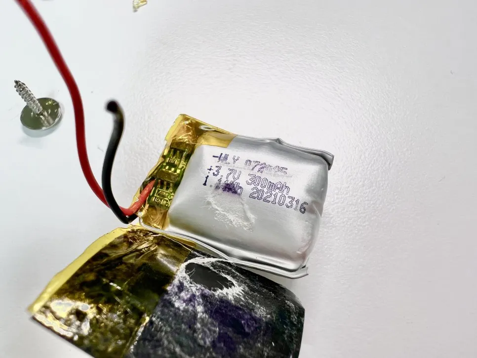 무게 추를 풀어주니 배터리가 튕겨져(?) 나왔습니다. 엄청나게 부풀어 있네요. 살펴보니 배터리는 따로 KC 안전 인증을 받지 않은 것 같습니다.
