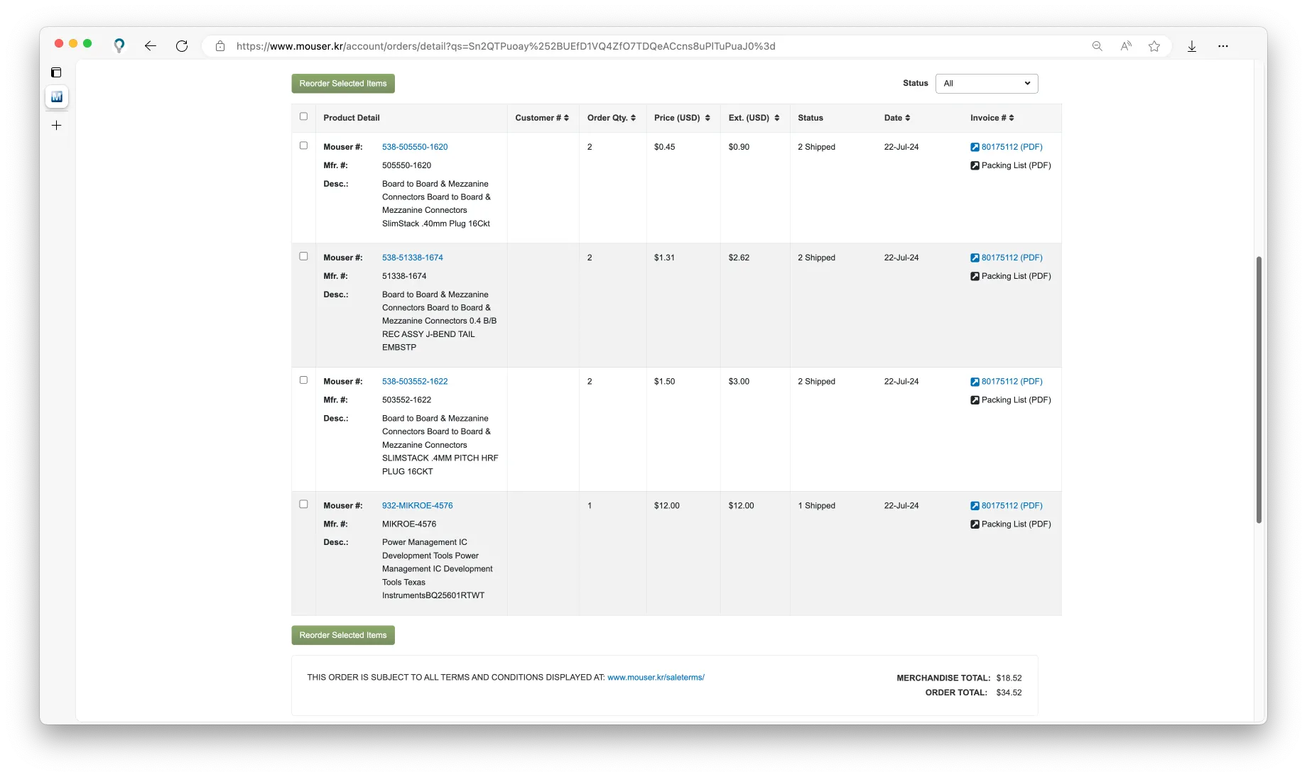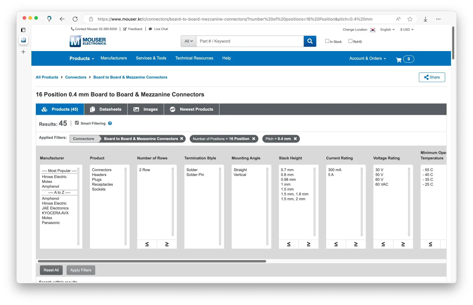 실측한 치수인 ‘피치 0.4mm’와 ‘핀 수 16핀’을 조건으로 마우저에 검색했을 때 40개 정도가 나왔습니다. 이 중 앞에서 사용한 Hirose는 제외(로고 각인이 없음), 잘 알려진 브랜드만 필터하게 되면 대략 20개 정도로 좁혀졌고, 소량 구매가 가능하면서 형태가 비슷한 것을 찾으니 2가지가 최종적으로 나왔습니다.