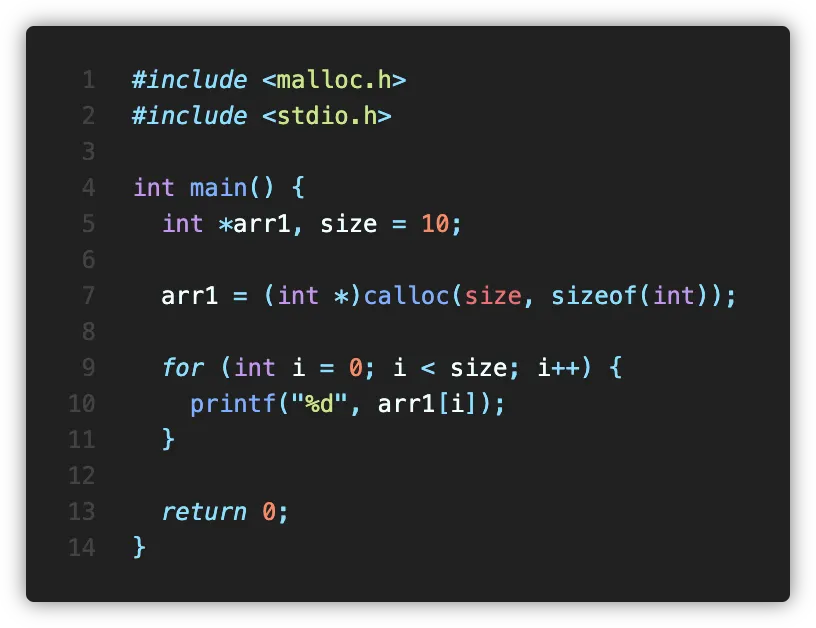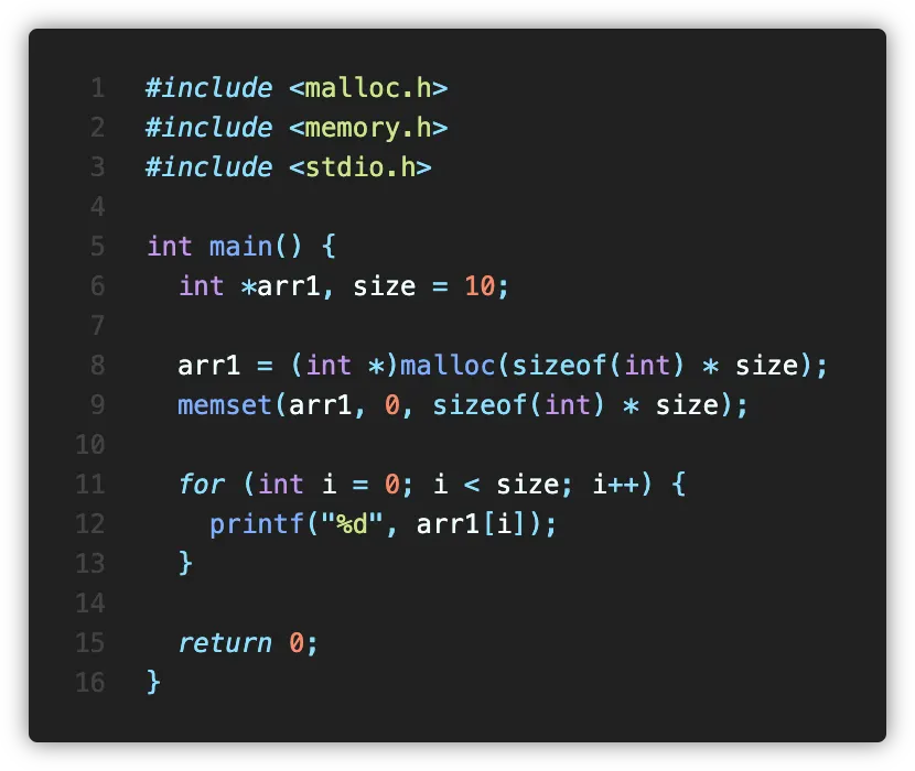 calloc() 함수는 malloc() 함수에 할당된 공간을 0으로 설정하는 memset() 함수가 추가된 버전이라고 생각하면 됩니다. 구조체 생성화 같이 메모리 할당과 동시에 0으로 초기화를 해야 하는 경우 주로 사용합니다.
