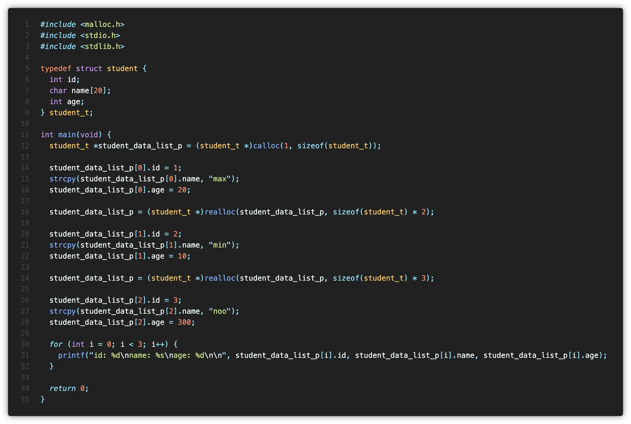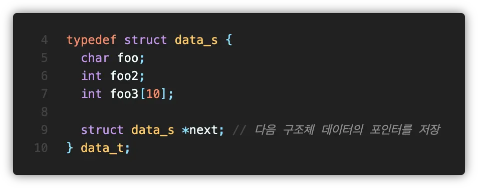 이를 해결하기 위한 방법으로는 구조체를 생성해 구조체 안에 다음 데이터의 포인터를 저장하게 하는 방법이 있습니다. 이러한 방법을 활용하면 메모리를 재할당하는 대신 새로운 메모리를 할당하고 기존 구조체에 새로 할당된 메모리의 포인터만 입력하면 되어서 효율적입니다.