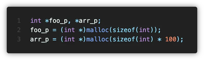 만약 int형 변수 하나를 위한 공간을 생성한다면 인자값으로 sizeof(int)를 입력하고, 2칸의 int형 배열을 입력한다면 sizeof(int) * 2를 입력하면 됩니다. 이때 반환값은 void * 타입이기 때문에 타입 지정 포인터에 저장하기 위해서는 형 변환이 필요합니다.