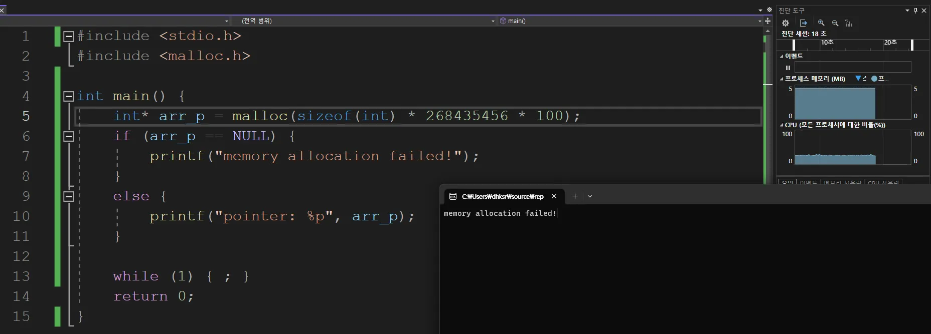 malloc()을 포함해 앞으로 다룰 메모리 동적 할당 함수들은 메모리 할당에 실패하면 NULL을 반환합니다. 위 사진과 같이 컴퓨터에 장착된 메모리보다 더 큰 100 GB의 공간을 할당하려 하면 메모리 할당에 실패하게 되어 NULL을 반환하며, if문을 이용해 할당 실패 여부를 모니터링해야 합니다.