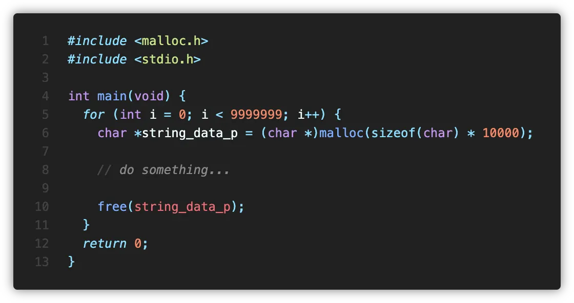 위 코드는 for문 안에서 각 루프마다 10000칸짜리 char형 배열을 생성하는 예시입니다. 6번 라인에서 동적할당한 메모리의 시작점(포인터)을 포인터 변수인 string_data_p에 저장하는것을 알 수 있는데요, 동작을 끝낸 10번 라인에 도달하게 되면 지역변수인 string_data_p가 사라지고 다음 루프가 다시 실행되게 됩니다.