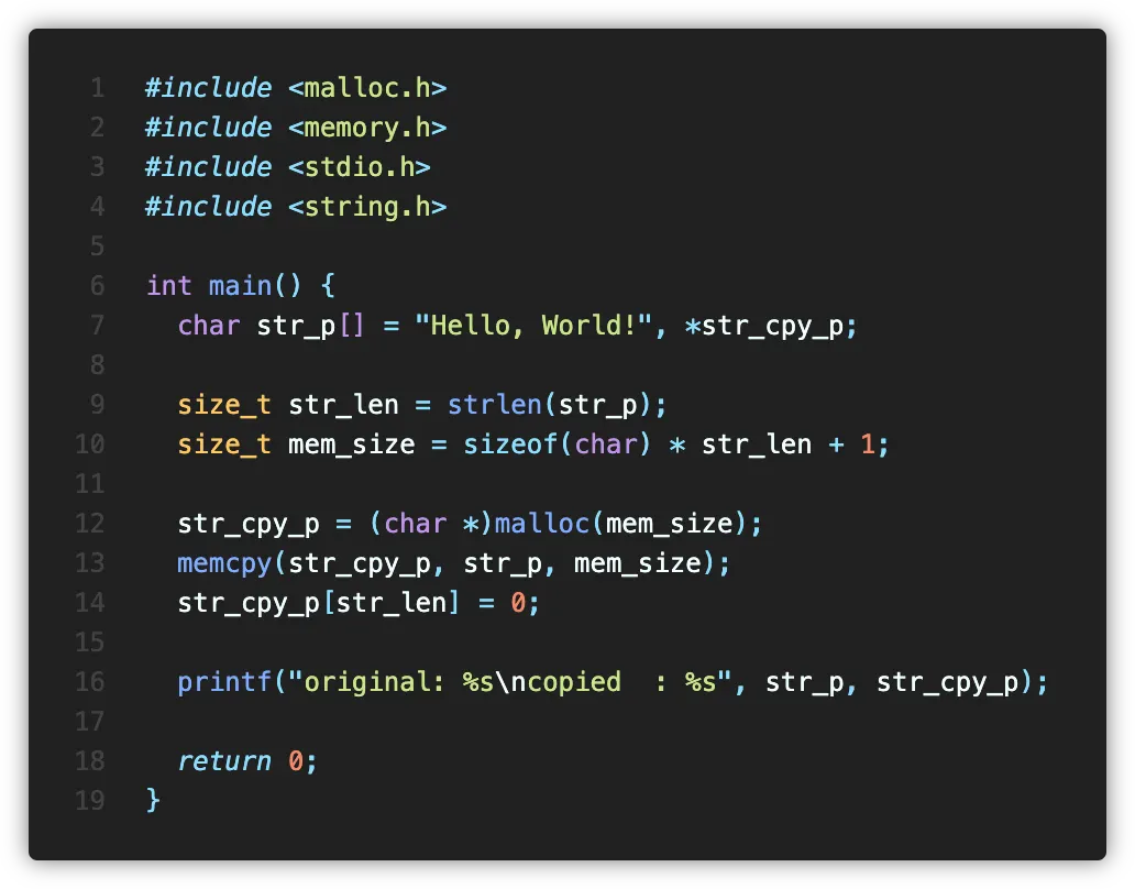 위 예제는 문자열 “Hello, World!”가 저장된 배열 str_p를 다른 메모리 공간에 복사한 후 복사된 배열의 포인터를 char형 포인터 변수 str_cpy_p에 저장하는 예제입니다.