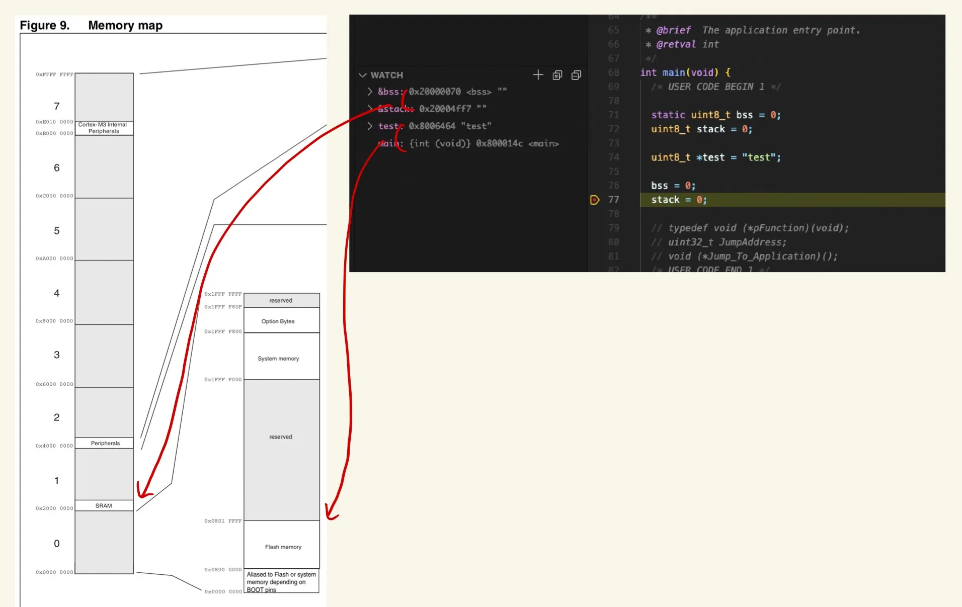 SRAM에 저장되는 변수들은 Memory Map에서 SRAM 구역인 0x2000 0000 이후에 위치하고 있고, Flash에 저장되는 문자열 리터럴과 함수는 Flash 구역인 0x0800 0000 이후에 위치하고 있는 것을 알 수 있습니다.