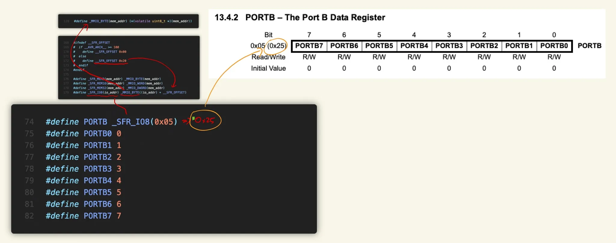 학창 시절에 AVR을 맛본(?) 기억에 의하면 GPIO 제어를 위해 PORTx 레지스터를 사용했습니다. ATmega328 기준으로 IDE 상에서 PORTB 키워드의 정의(iom328p.h)로 가보면 _SFR_IO8 매크로(sfr_defs.h)를 통해 전처리 과정 이후에는 *0x25로 해석되는 것을 확인할 수 있습니다.