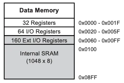 AVR의 경우 SRAM과 I/O가 동일한 메모리 영역에 묶여있는 MMIO 방식이지만 하버드 아키텍처를 사용하기 때문에 Data, EEPROM 영역은 메모리 영역과 분리되어 있습니다.