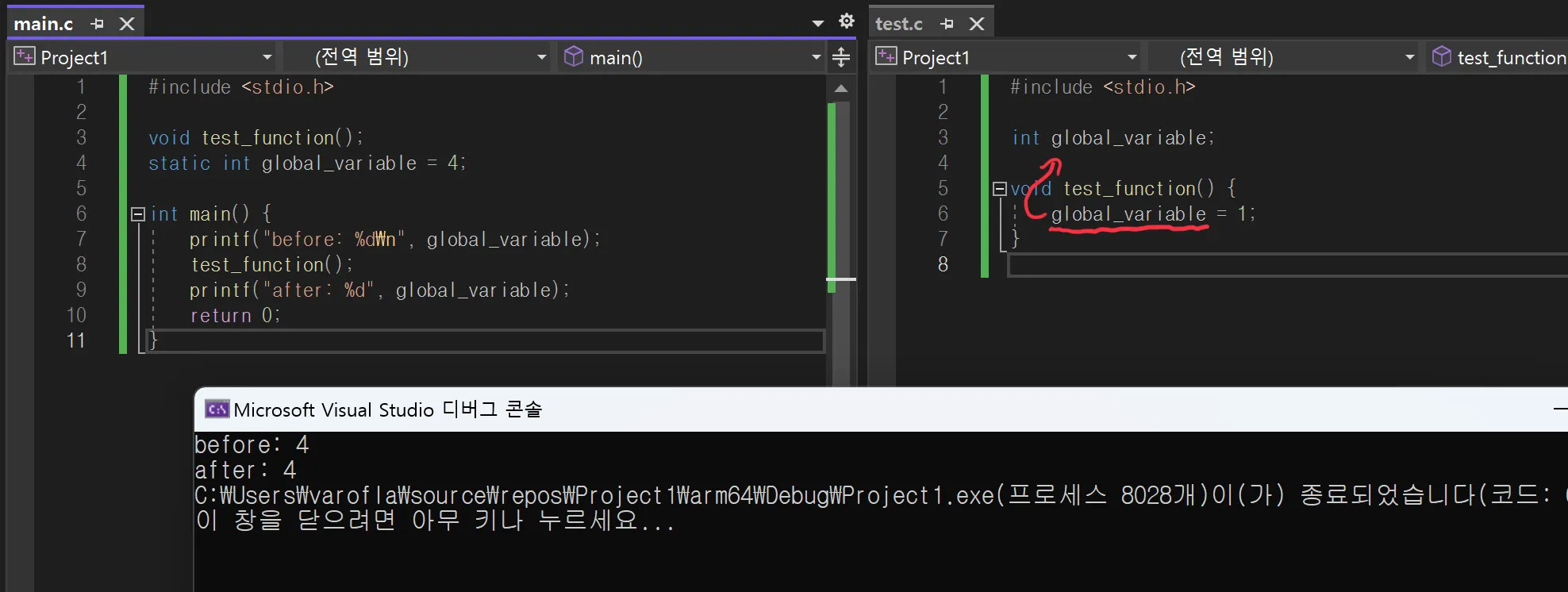여기서 main.c의 전역 변수를 static 키워드를 붙여 정적 전역 변수로 만들게 되면 test.c에서 만들어진 전역 변수는 test.c의 전역 변수로 생성되어 main.c에서 생성한 변수가 변하지 않게 됩니다.