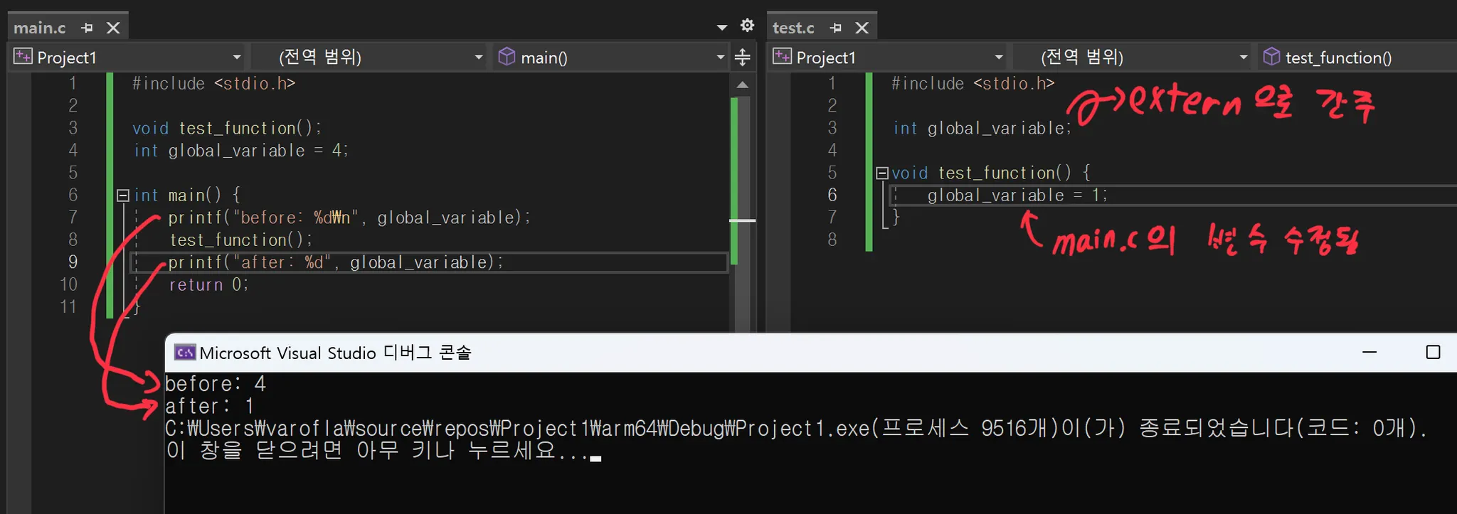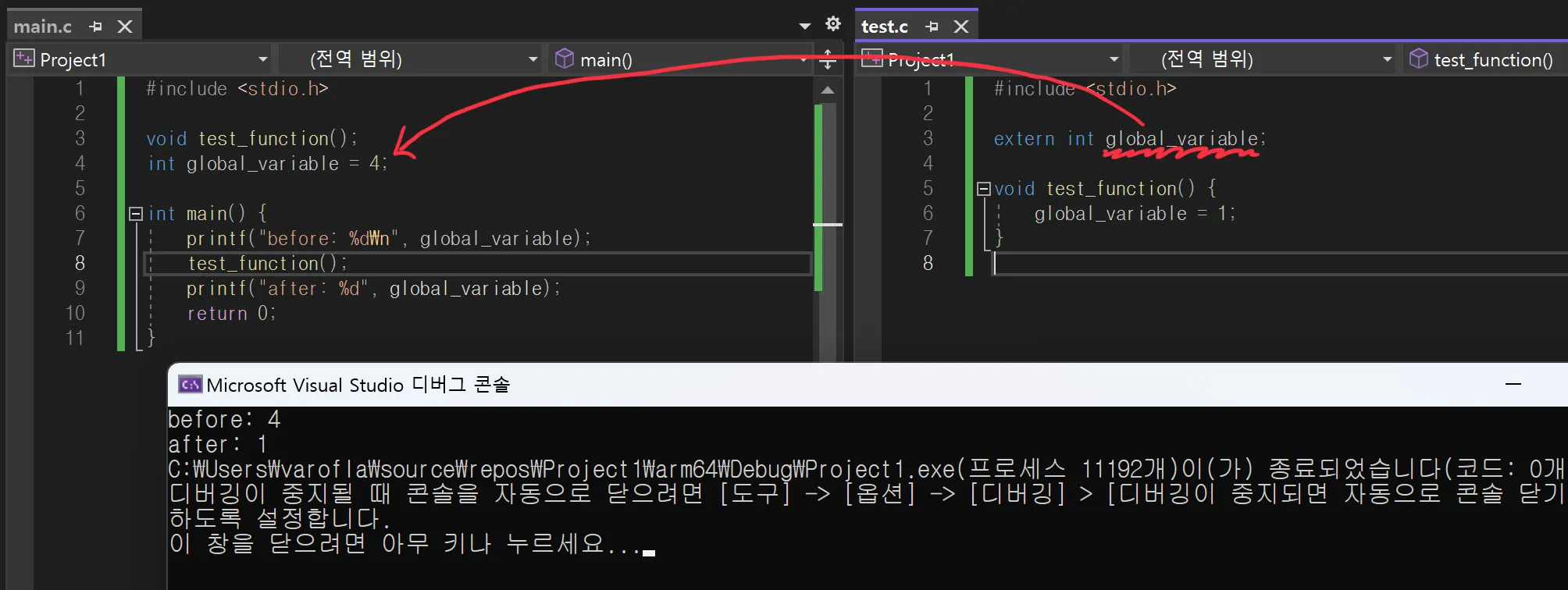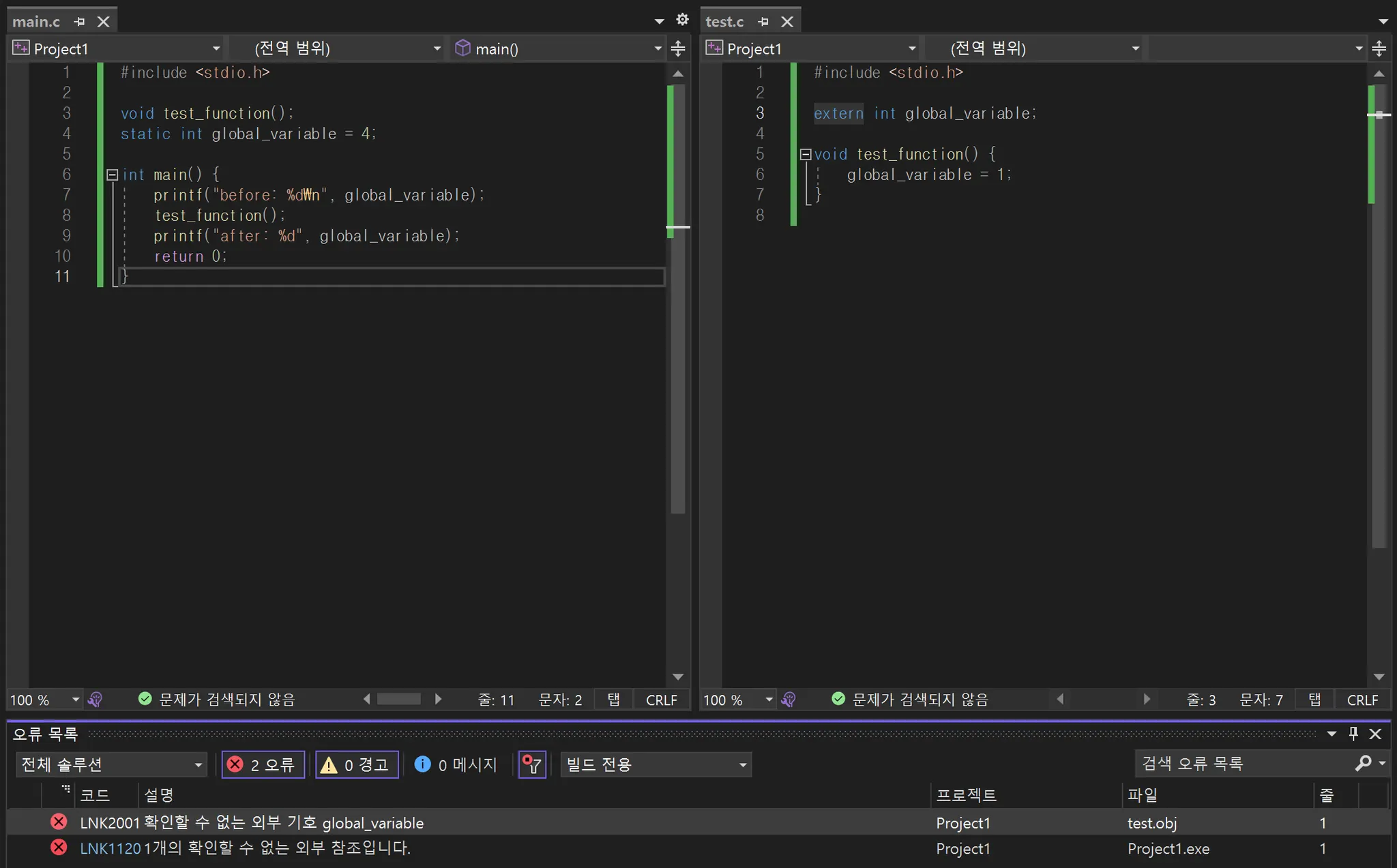 만약 이 상태에서 test.c의 변수에 extern 키워드를 붙이면 test.c에서 main.c의 global_variable을 참조하려 하더라도 오류가 발생하게 됩니다.
