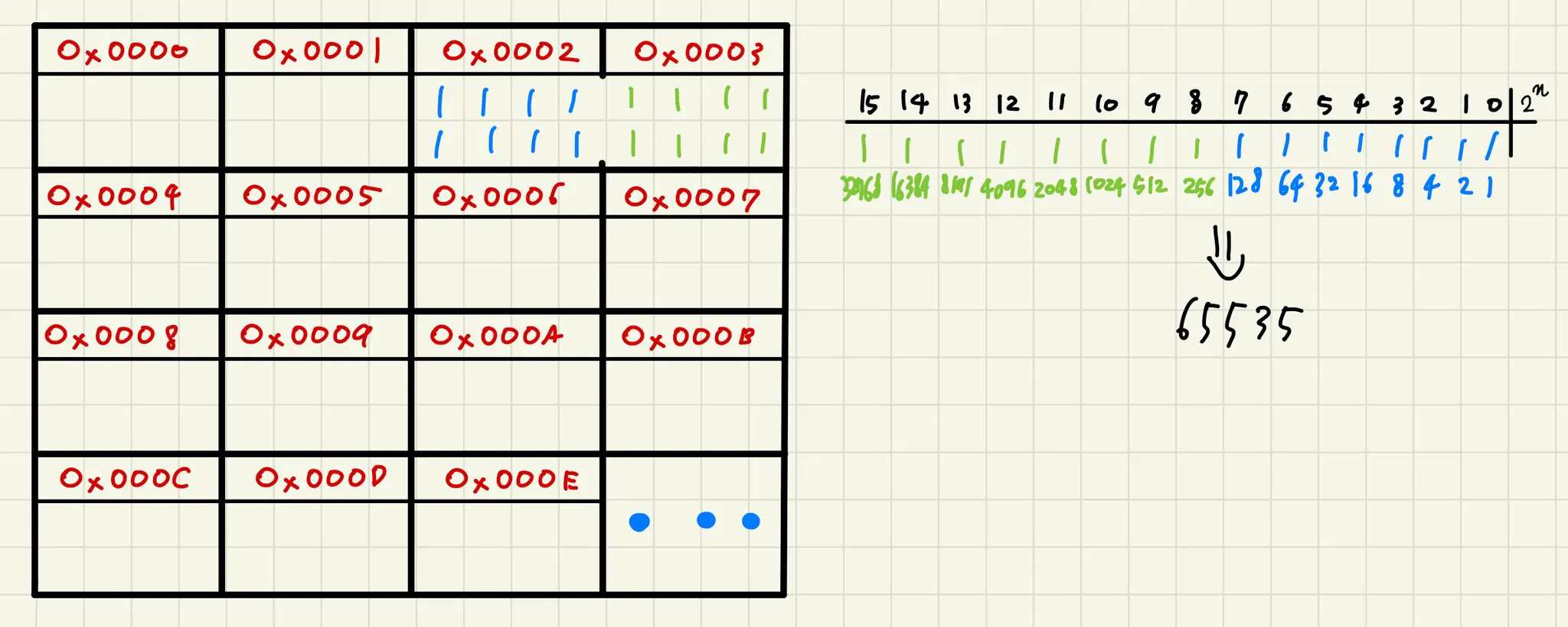 간단합니다. 옆의 벽을 허물어버린다고 생각하면 되는데요, 바로 옆에 있는 공간을 이어붙여 표현할 수 있는 숫자의 크기를 확장합니다. 위와 같이 0x0002과 0x0003을 함께 사용하면 0~65535까지, 총 65537단계를 표현할 수 있으며, 이는 short 자료형에 해당합니다.
