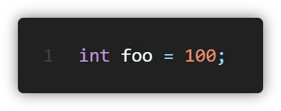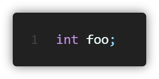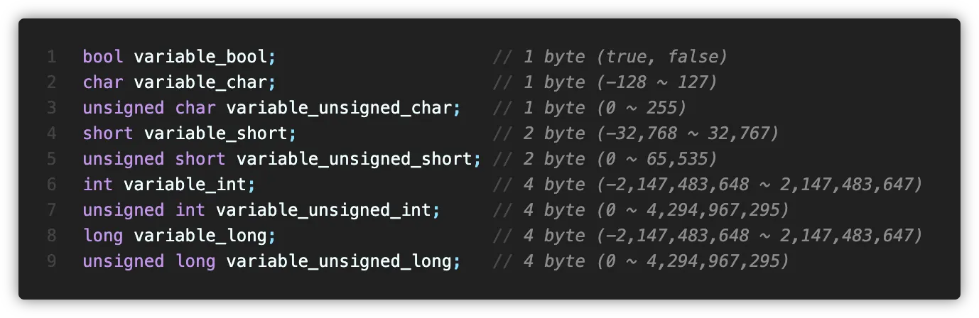 앞선 의 자료형의 이름을 먼저 작성하고 그 뒤에는 변수의 이름을, 그 뒤에는 코드 한 줄 이 끝났음을 의미하는 세미클론(;)을 입력합니다.