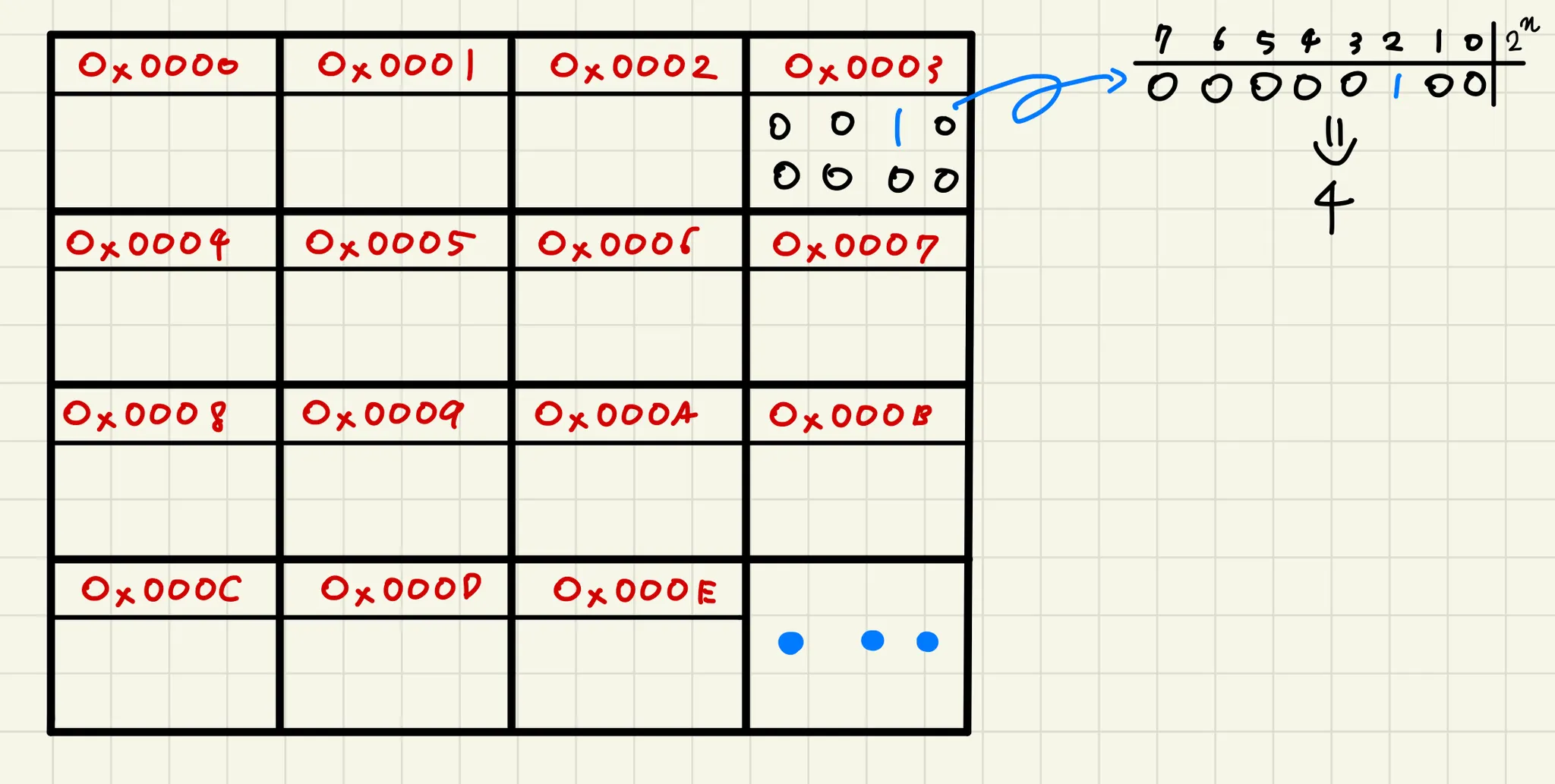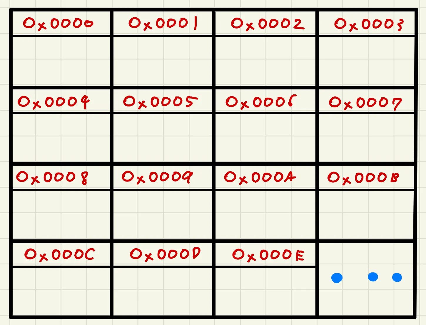 8 bit를 표현할 수 있는 각 공간은 아파트의 호수와 같이 고유한 주소지를 가집니다. 이때 이 주소지는 16진수를 이용하며 0부터 시작해 메모리의 공간의 끝까지 부여되어 있습니다. 즉, 1번째 방은 0x0000이고 6번째 방은 0x000F, 17번째 방은 0x0010이 되겠죠.