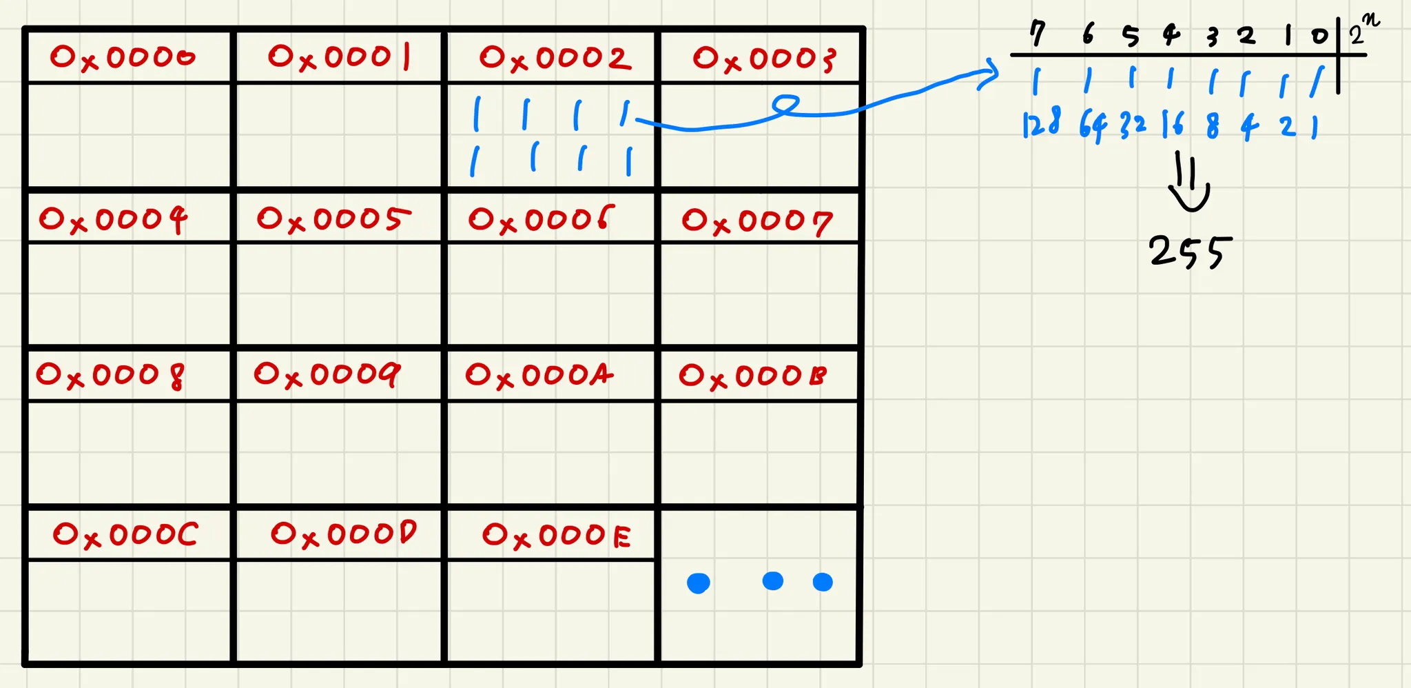 이때 메모리의 8개 비트를 모두 1로 설정한 것이 메모리의 한 공간에서 표현할 수 있는 가장 큰 숫자가 됩니다. 예를 들어 0x0002에 저장된 2진수 11111111를 10진수로 변환하면 255입니다.
