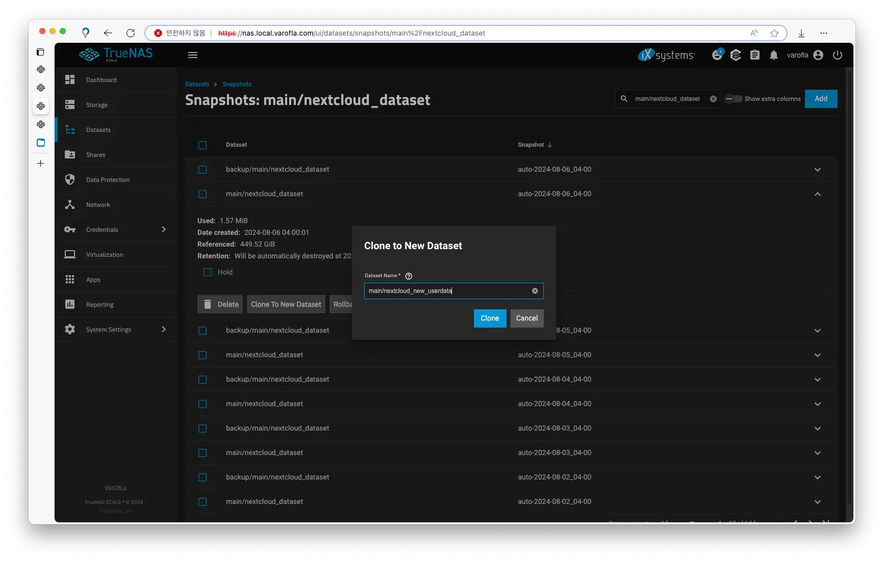 터미널에 접속한 후 cp 명령을 날렸다가 시간이 너무 오래 걸리길레 스냅샷을 활용했습니다. 직전 스냅샷을 새 데이터셋으로 복제한 후 ACL 권한을 수정했습니다. (참고로 데이터셋 이름은 nextcloud_new_userdata입니다.)