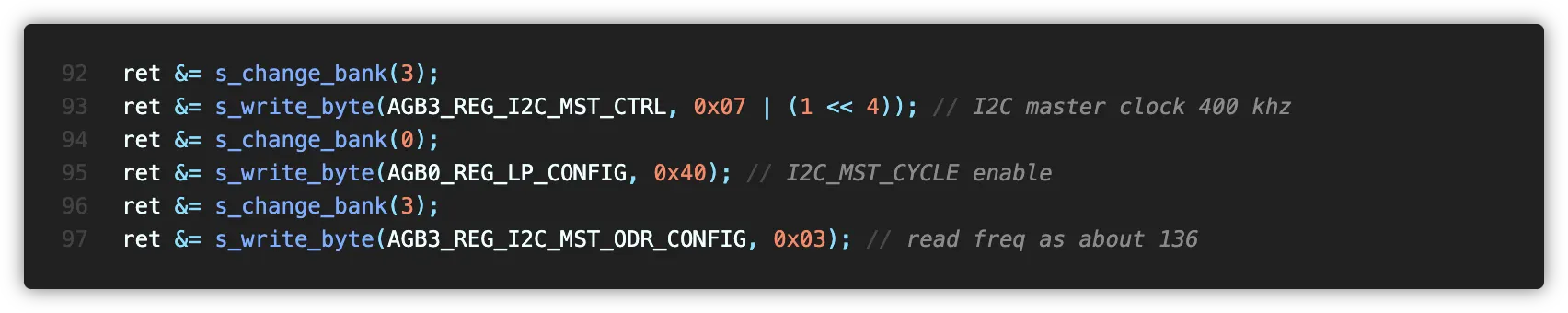 I2C Slave인 AK09916을 설정합니다. 우선 리셋해준 후 100 Hz 주기로 데이터를 자동으로 읽도록 하였습니다.