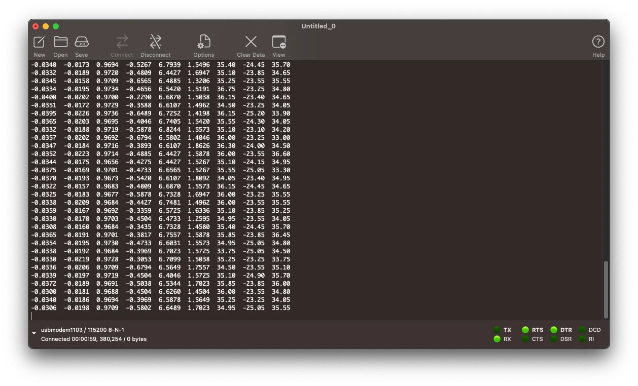 출력되는 데이터는 센서의 RAW 데이터이기 때문에 orientation을 얻기 위해서는 bias 설정, fusion filter 적용이 필요합니다.