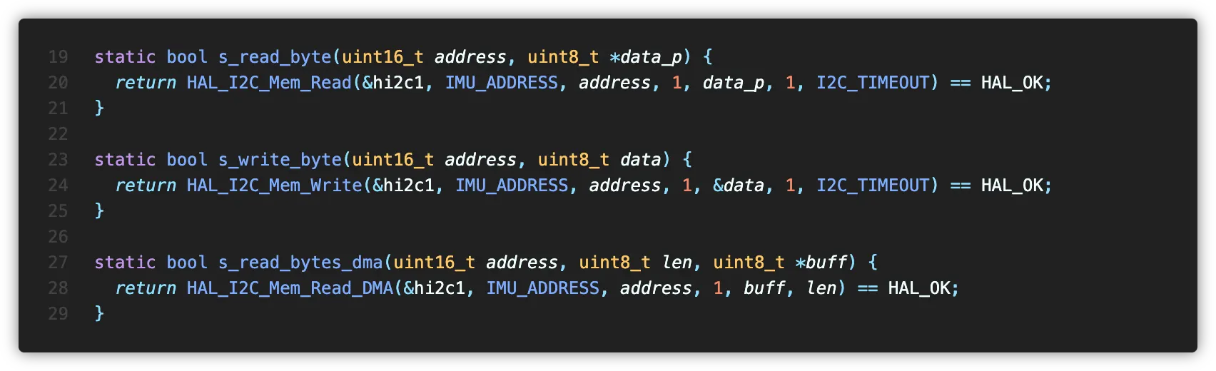 우선 레지스터를 읽을 때 사용할 버퍼를 하나 만들고 I2C 통신 함수의 처리결과를 저장할 변수를 선언하였습니다.