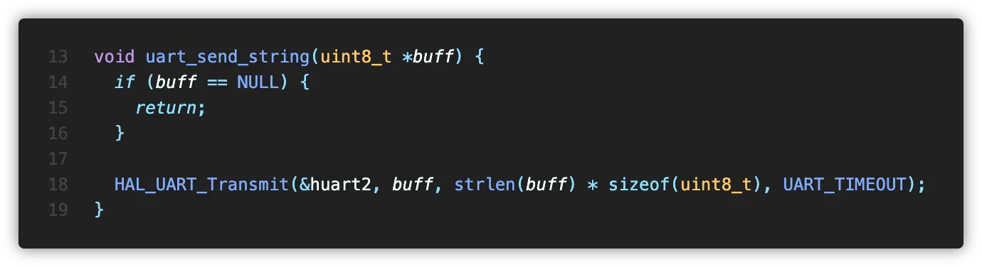 uart send 인터페이스인 uart_send_string()의 정의는 아래와 같습니다.