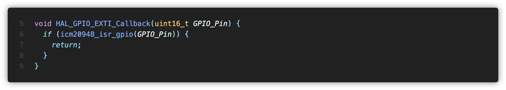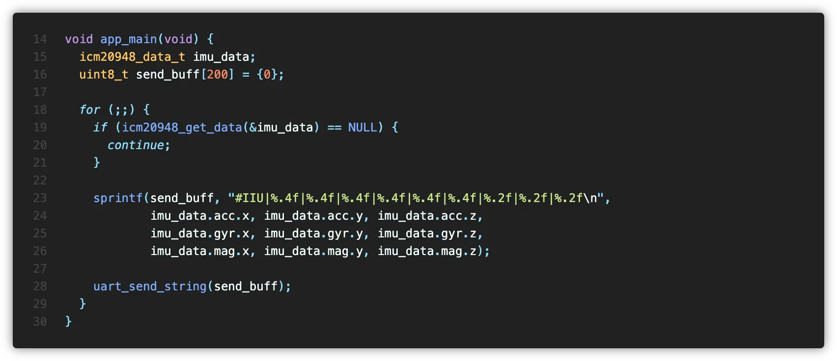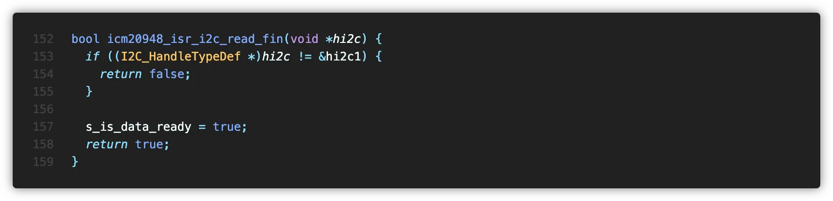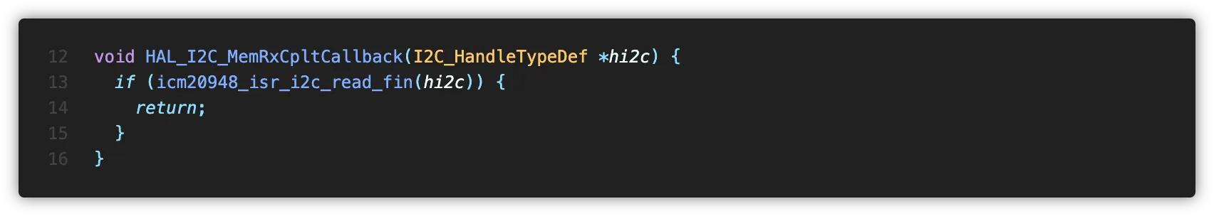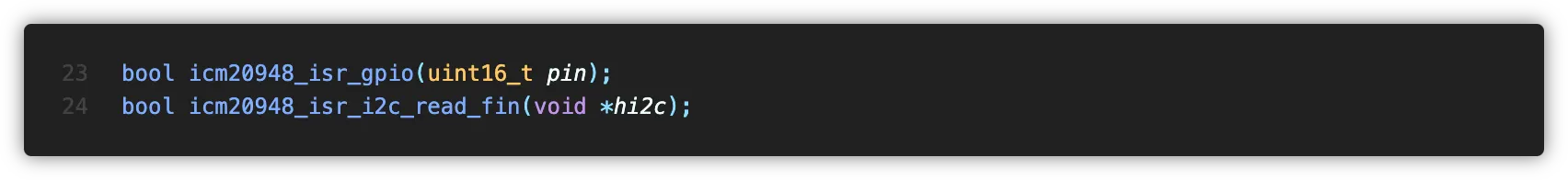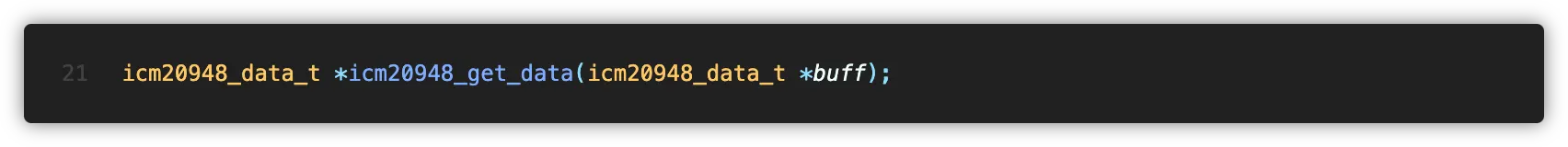 Application측에서 icm20948_get_data() 함수를 호출하면 새 데이터의 준비 여부를 확인한 후 IMU 데이터를 버퍼에 쓰고 반환합니다.