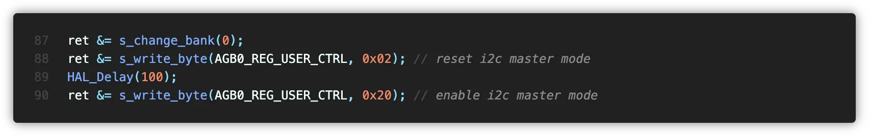 앞서 언급했듯이 DMA 활용을 위해 AK09916센서에 직접 통신하는것이 아닌, ICM20948을 I2C Master Mode로 설정해 이를 경유하여 읽는다고 하였습니다. 이때문에 AK09916의 레지스터에 접근하기 위해서는 추가적인 루틴이 필요한데요, 이를 위한 함수를 정의하였습니다.