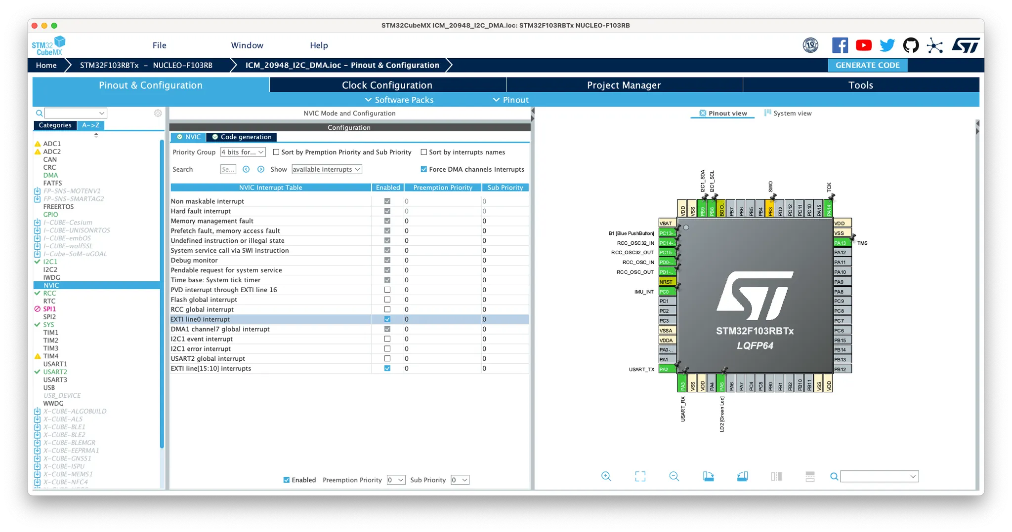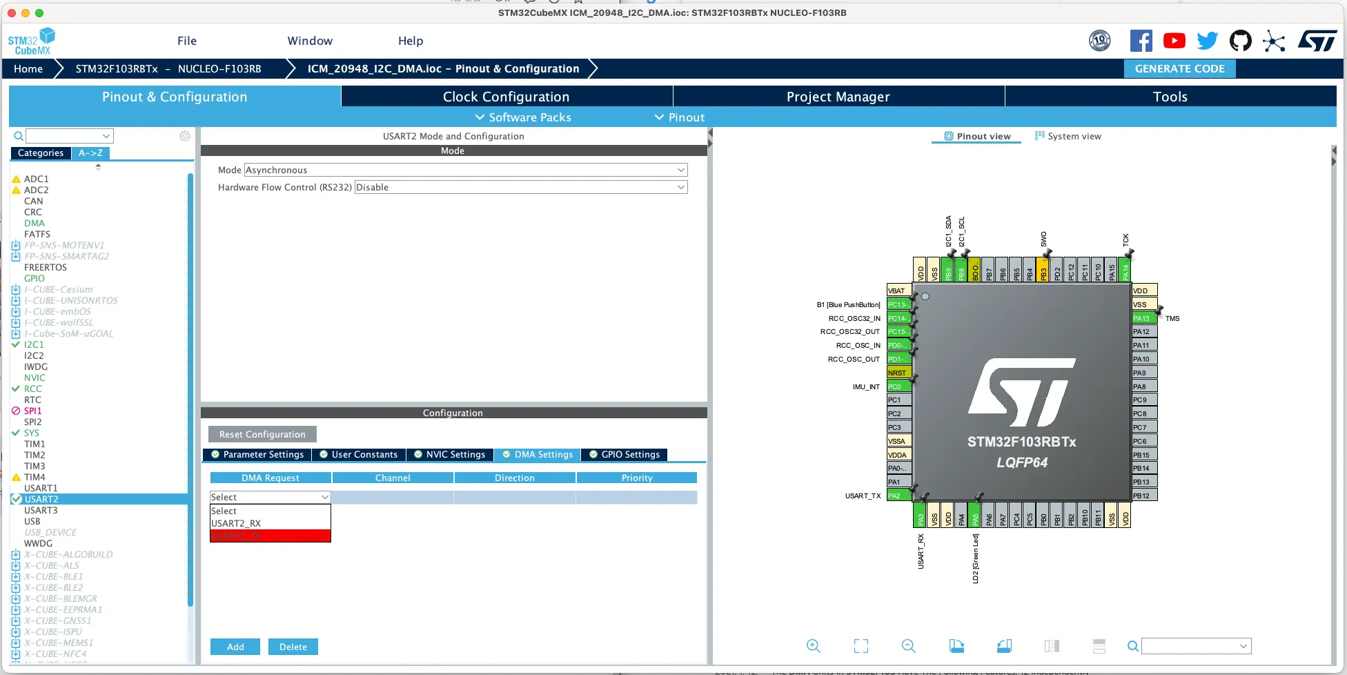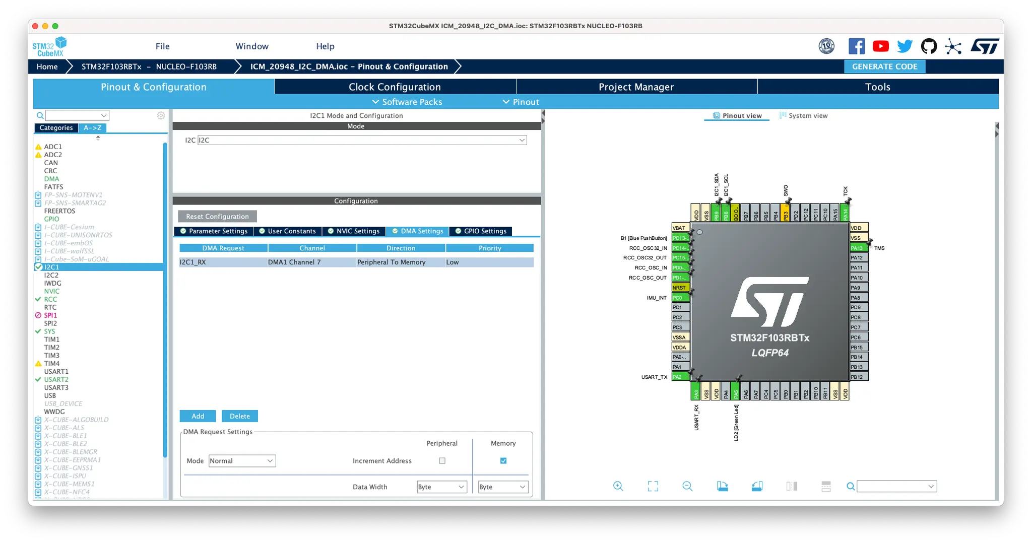 누클레오보드의 Arduino 스타일 단자로 나온 I2C핀은 I2C1으로, I2C DMA RX를 사용하게 되면 ST-Link에서 PC와 USB로 연결되는 USART2 DMA TX와 DMA 채널이 겹치게 됩니다. (DMA1 CH7)