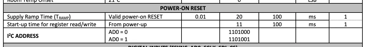 센서의 AD0핀의 상태에 따라 두 가지의 센서 주소를 가집니다. AD0핀은 기본적으로 Floating상태이기 때문에 만약 모듈의 AD0에 Pull-resistor가 연결되어있지 않다면 AD0핀을 GND나 VCC중 한곳에 연결해두어야합니다.