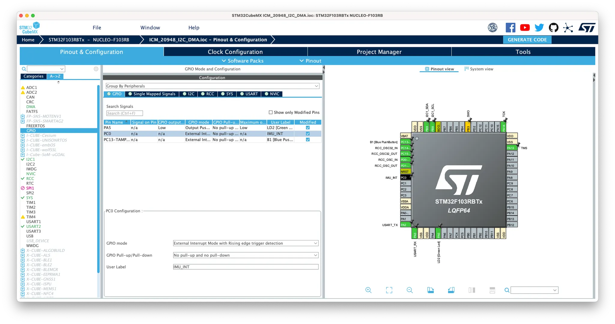 NUCLEO 보드의 A5에 해당하는 PC0을 EXTI로 설정하였습니다. 나중에 IMU의 인터럽트를 Active High로 할 예정이기 때문에 상승 펄스를 읽도록 하였습니다.