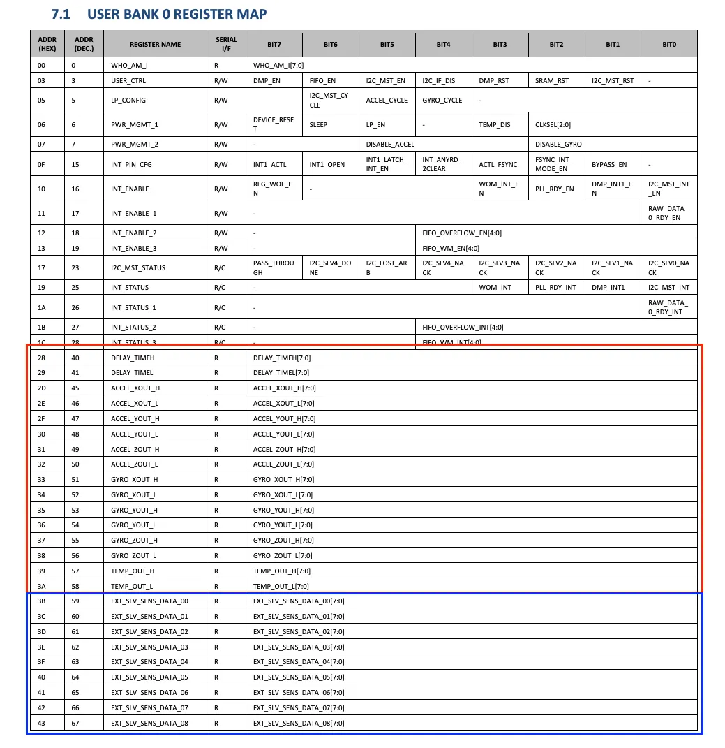 Auxiliary 센서에서 읽은 데이터는 BANK0의 EXT_SLV_SENS_DATA_00부터 SLV0~SLV4 순서로 차례로 저장되며, 각 센서 데이터의 시작점은 앞선 I2C_SLVx_CTRL 레지스터의 3:0 값의 합으로 정해집니다. 즉, 만약 첫 번째 센서가 5 len의 데이터를 읽는다면 두 번째 센서에서 읽힌 데이터는 5의 offset을 적용해 EXT_SLV_SENS_DATA_05부터 저장되는것이죠.