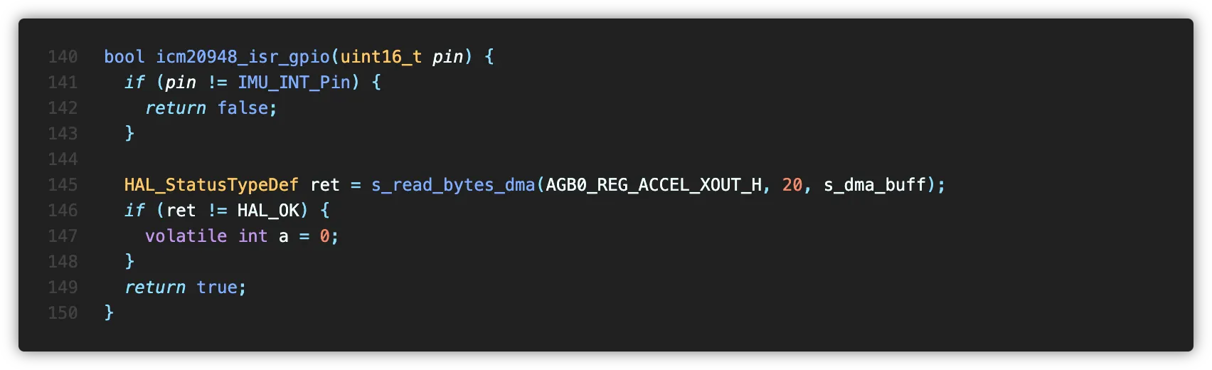 센서에서 데이터 준비 완료 인터럽트와 DMA Read Finish 인터럽트를 처리하는 각각의 ISR입니다. HAL의 ISR에 이 함수를 추가해 사용합니다.
