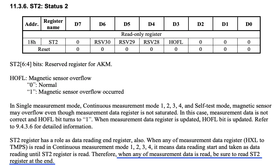 그 후 ICM-20948에게 AK09916의 레지스터 데이터를 읽어도록 요청해야하는데요, AK09916의 데이터시트에 따르면 Continuous measurement mode에서는 각 데이터를 읽은 후 ST2를 읽도록 강제하기 때문에 지자기 센서 데이터 레지스터인 HXL~HZH(6 bytes) 이외에도 ST2까지 추가로 2개의 바이트를 더 읽어야 했습니다.