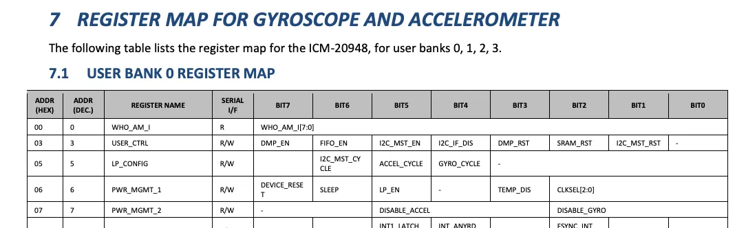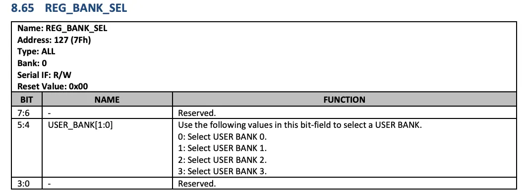 내장된 센서가 많고 기능도 다양하다 보니 하나의 레지스터 범위로는 해결이 안되었나봅니다. 0~3까지 총 4개의 Register Bank가 존재하며, 이를 전환해가면서 레지스터를 건들여야합니다.