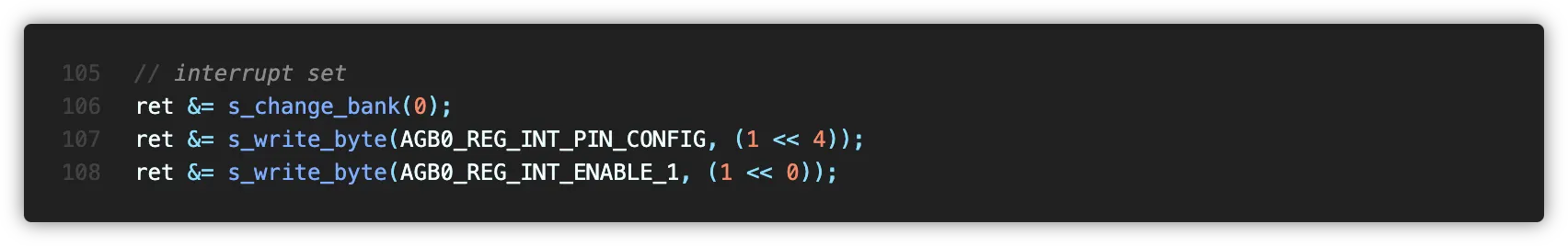 마지막으로 인터럽트를 켜주었습니다. INT_PIN_CFG 레지스터의 4번 비트를 켜 인터럽트 상태를 초기화한 후 인터럽트를 enable하였습니다.