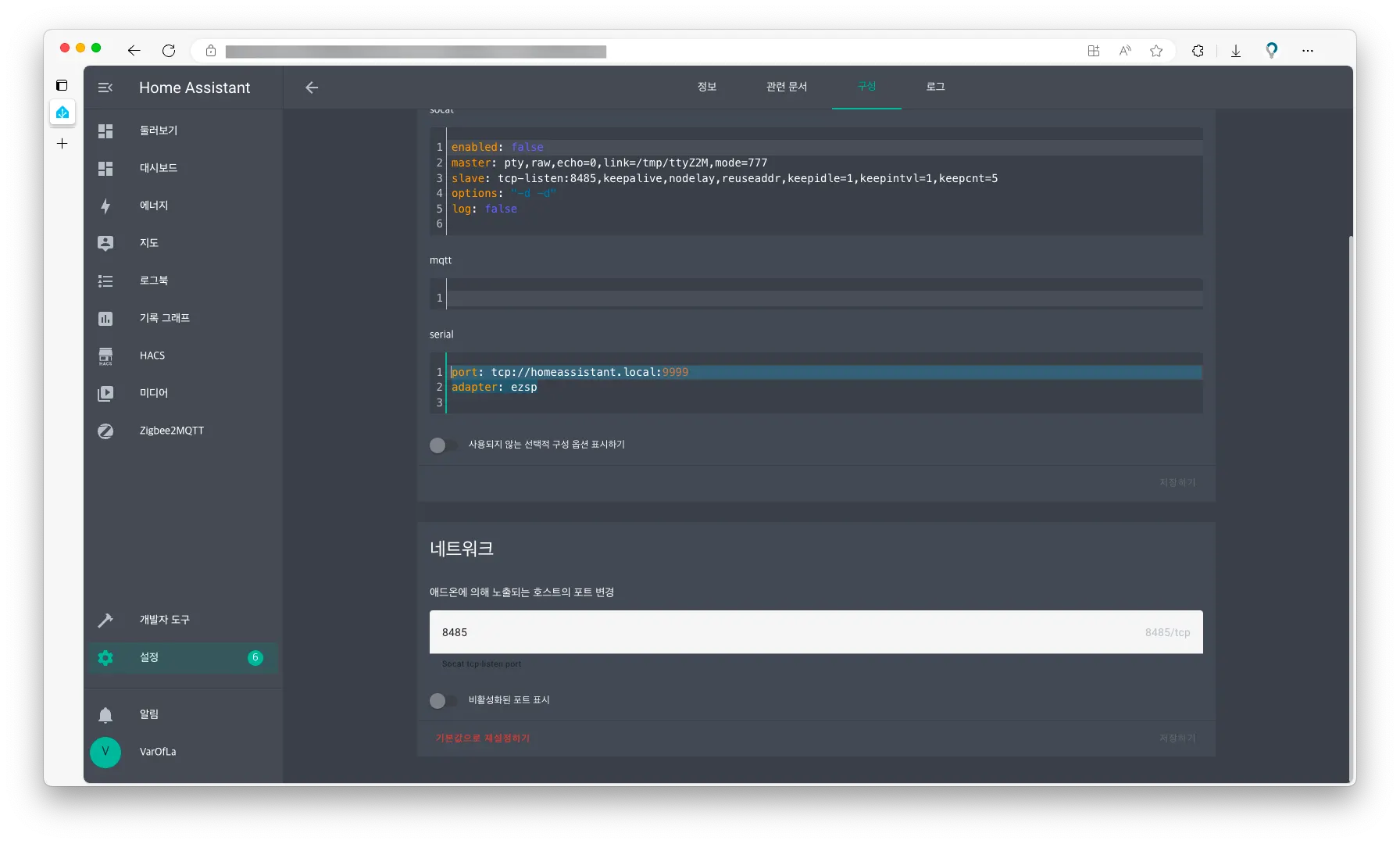 Z2M 애드온 설정에서 구성 탭에 들어가 serial 설정에 위 내용을 붙여넣습니다.
