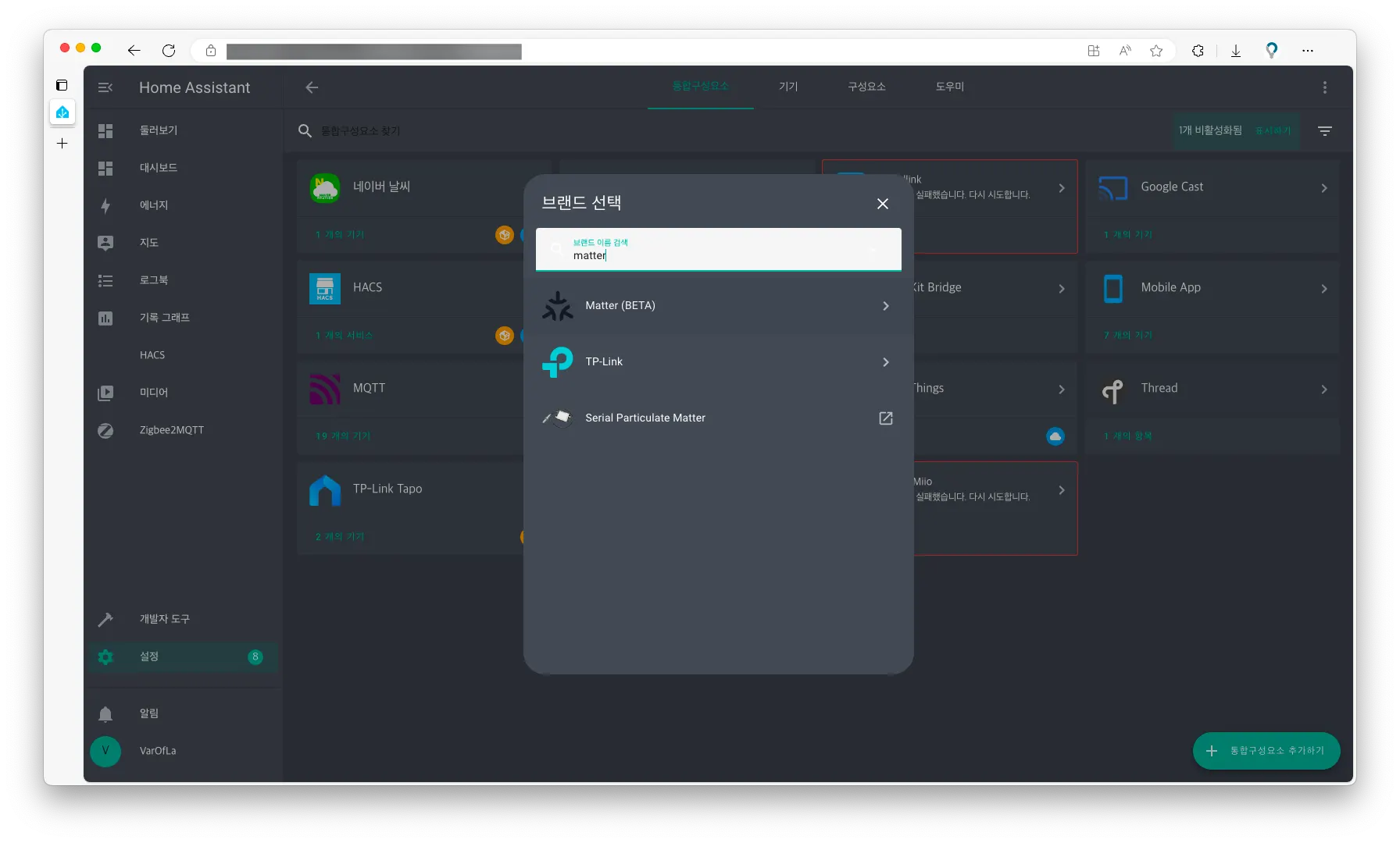 다음은 Matter 구성요소를 추가해 보았습니다. Matter를 검색하고 Matter (BETA)를 설치했습니다.