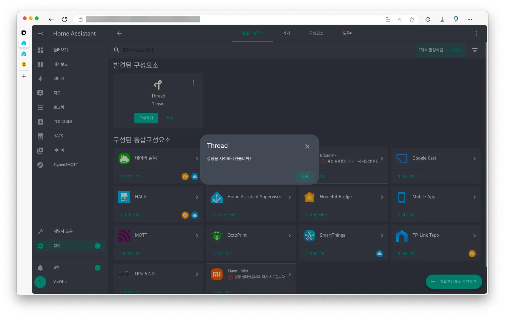 멀티 프로토콜이 잘 설정되었으면 구성요소에서 Thread가 자동으로 표시되는데요, 구성하기 버튼을 클릭해 구성요소를 추가해주었습니다.