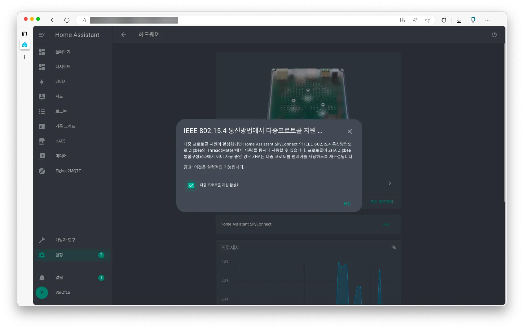 앞서 언급한 내용과 같이 SkyConnect에서 Zigbee와 Thread를 함께 사용하려면 펌웨어를 업데이트해야 합니다. HA에서는 이를 다중 프로토콜 지원이라 부르는데요, 설정→시스템→하드웨어→Home Assistant SkyConnect 구성 버튼을 클릭한 후 다중 프로토콜 지원 활성화 버튼을 클릭하면 SkyConnect의 펌웨어를 업데이트하고 다중 프로토콜 지원을 위한 HA측 애드온을 자동으로 설치합니다.