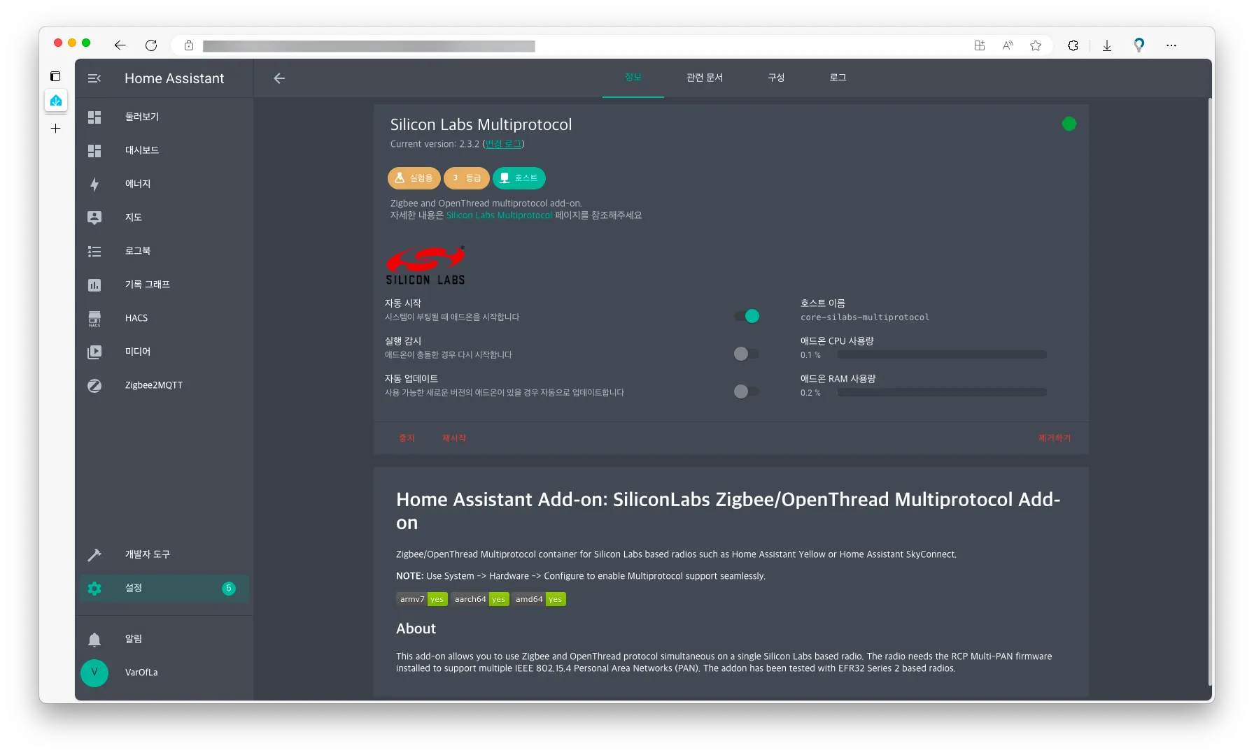 위의 과정을 완료한 후 애드온 페이지에 가보면 Sillicon Labs Multiprotocol이라는 애드온이 생기게 됩니다.