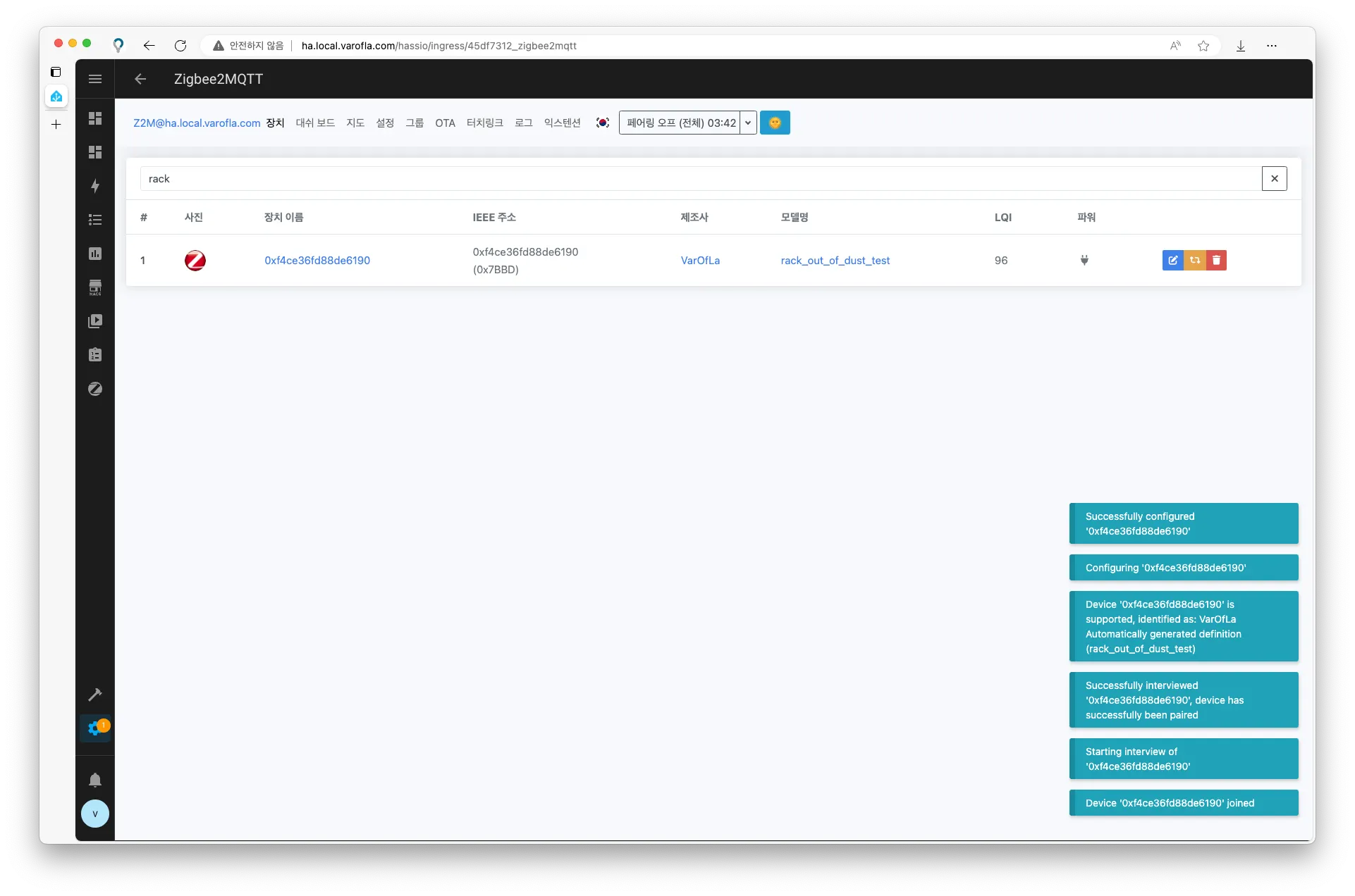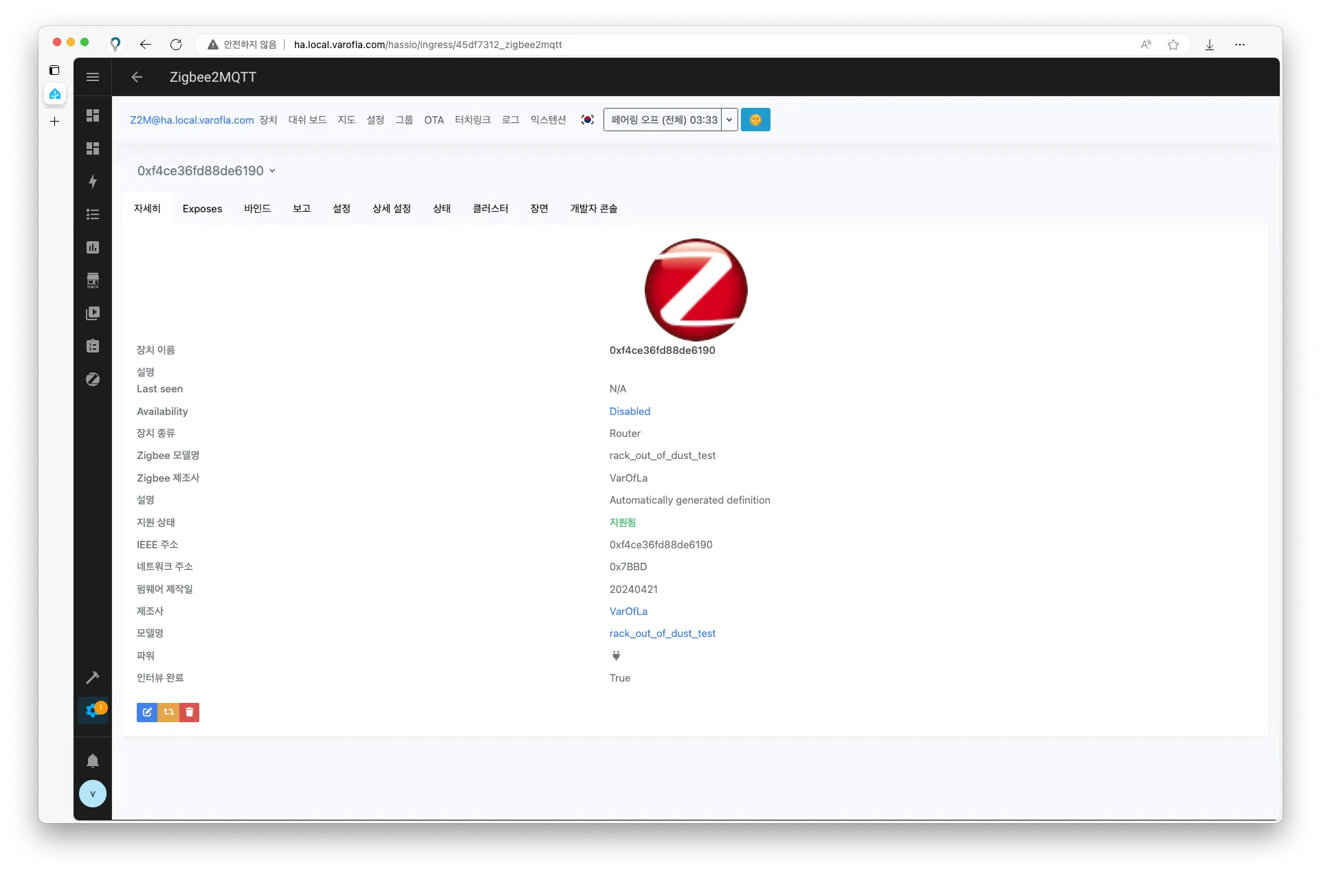 이 상태로 디바이스를 Z2M에 추가하게 되면 등록되지 않은 장치라는 오류가 발생합니다.