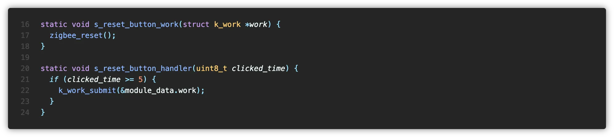 ZigBee 네트워크 탈퇴를 위한 zigbee_reset() 함수는 ISR에서 사용이 불가능해 System WorkQueue에서 실행해주었습니다.