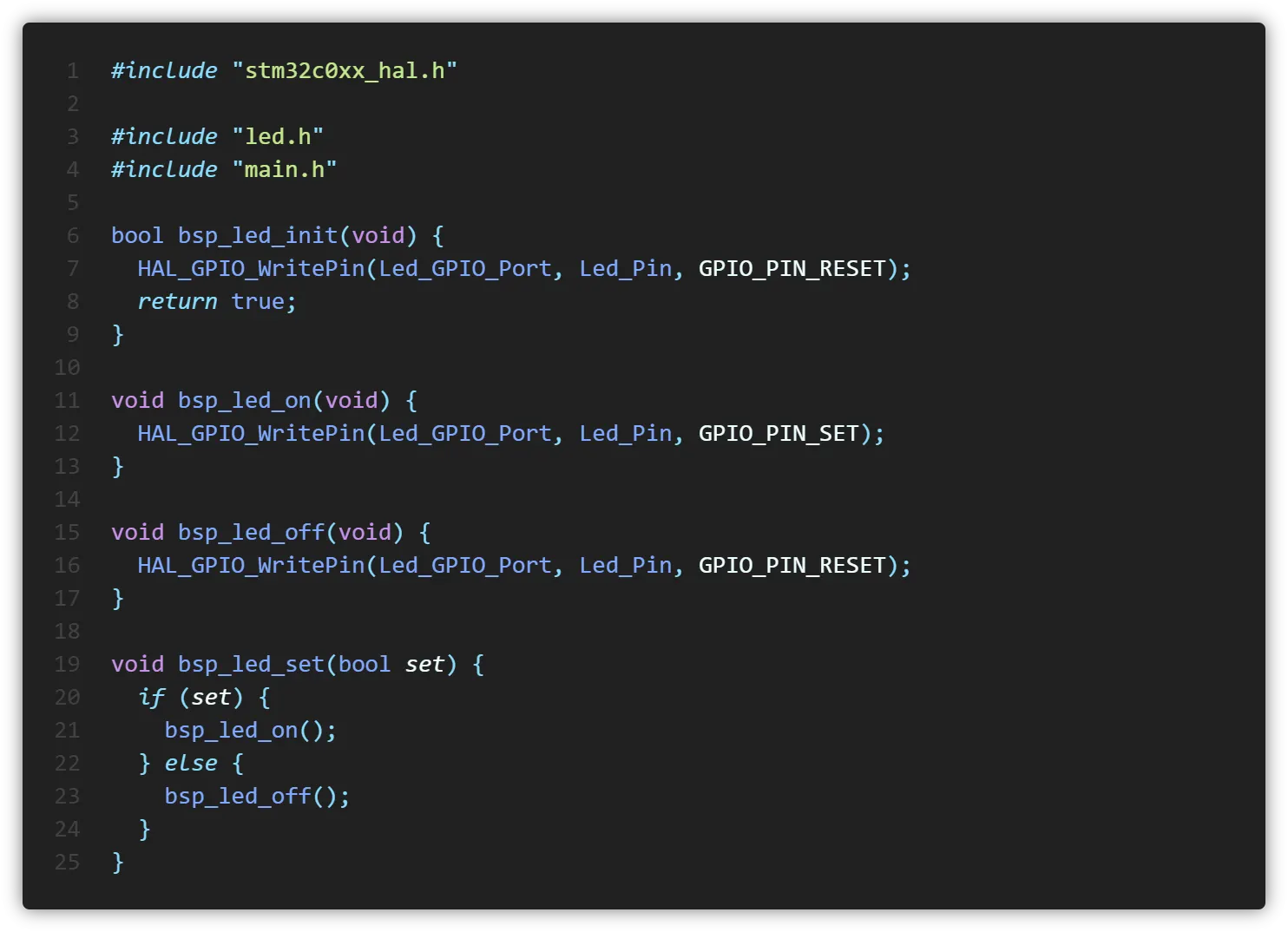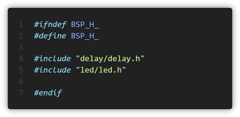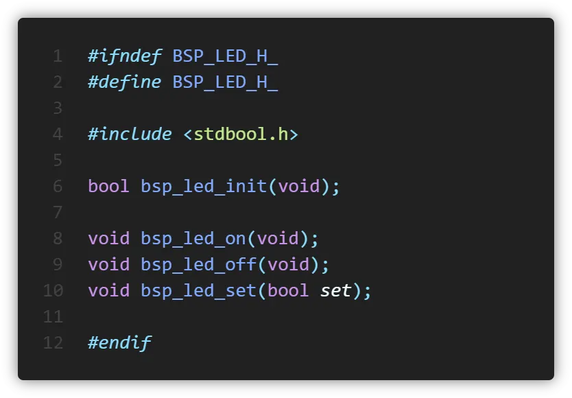 그 후 bsp.h에는 led.h를 include시켜주었고 led.h에는 가드와 LED 제어를 위한 함수를 선언하였습니다.