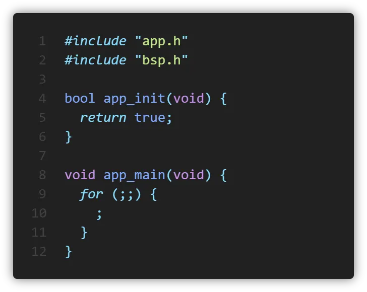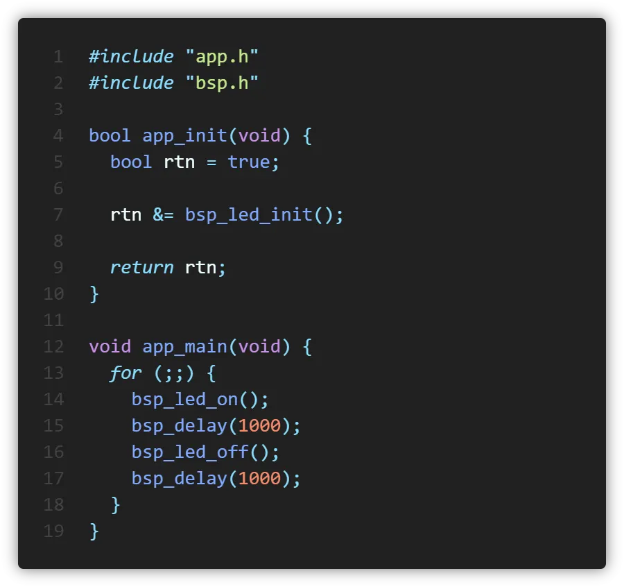 app_init() 함수에서는 BSP계층의 init 함수를 호출하고 결과를 반환합니다. 여기서는 일단 true를 반환하도록 해두었습니다.
