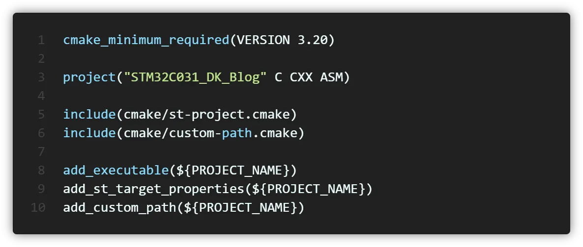 CubeIDE를 사용하지 않기 때문에 추가한 파일들의 구조를 직접 CMakeLists.txt에 반영하여야 합니다. 프로젝트 디렉토리의 CMakeLists.txt 파일을 확인해 보면 cmake/st-project.cmake 파일에 대부분의 설정이 저장되어 있다는 것을 알 수 있습니다.