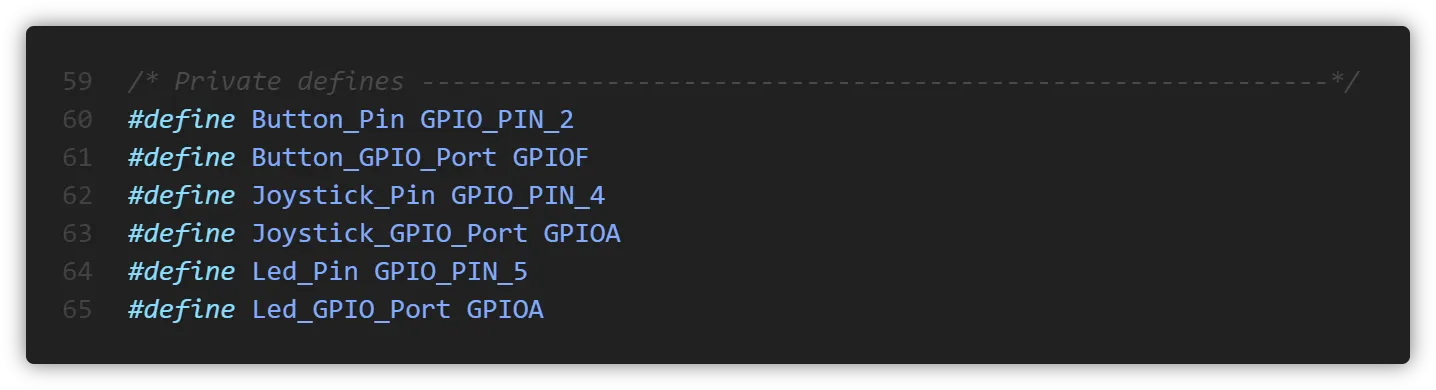 따라서 코드를 생성한 후 main.h에 들어가 보면 위와 같이 GPIO가 정의되어 있는 것을 확인할 수 있습니다. 여기서 온보드 LED의 핀 번호와 포트 번호는 각각 Led_Pin, Led_GPIO_Port입니다.