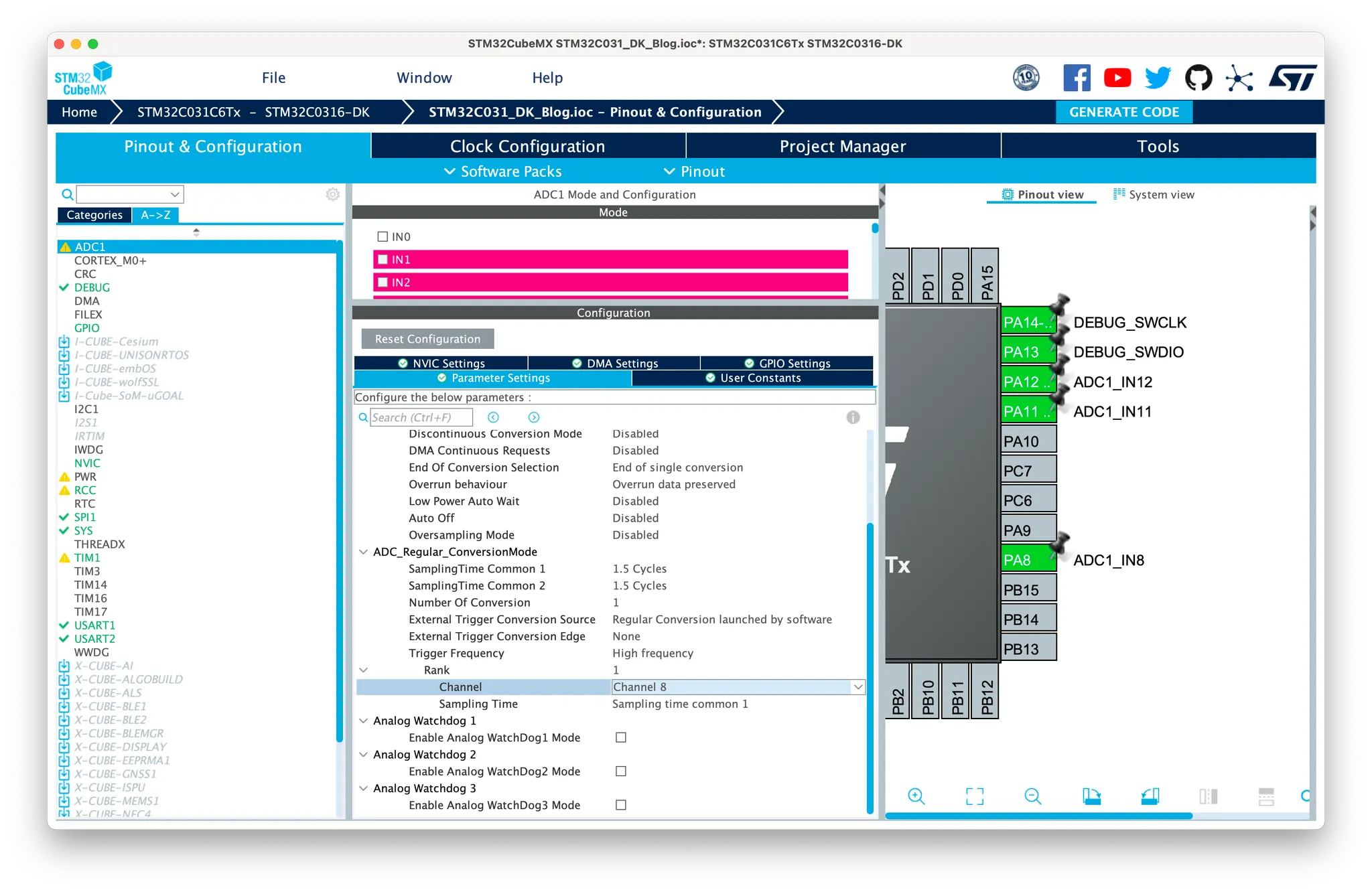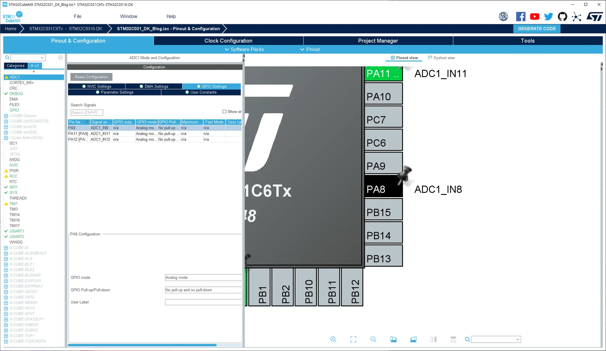 CubeMX에서 STM320316-DK 프리셋을 선택해 프로젝트를 생성하면 위와 같이 PA8에 ADC 채널 8번이 연결되어 있는 것을 확인할 수 있습니다.